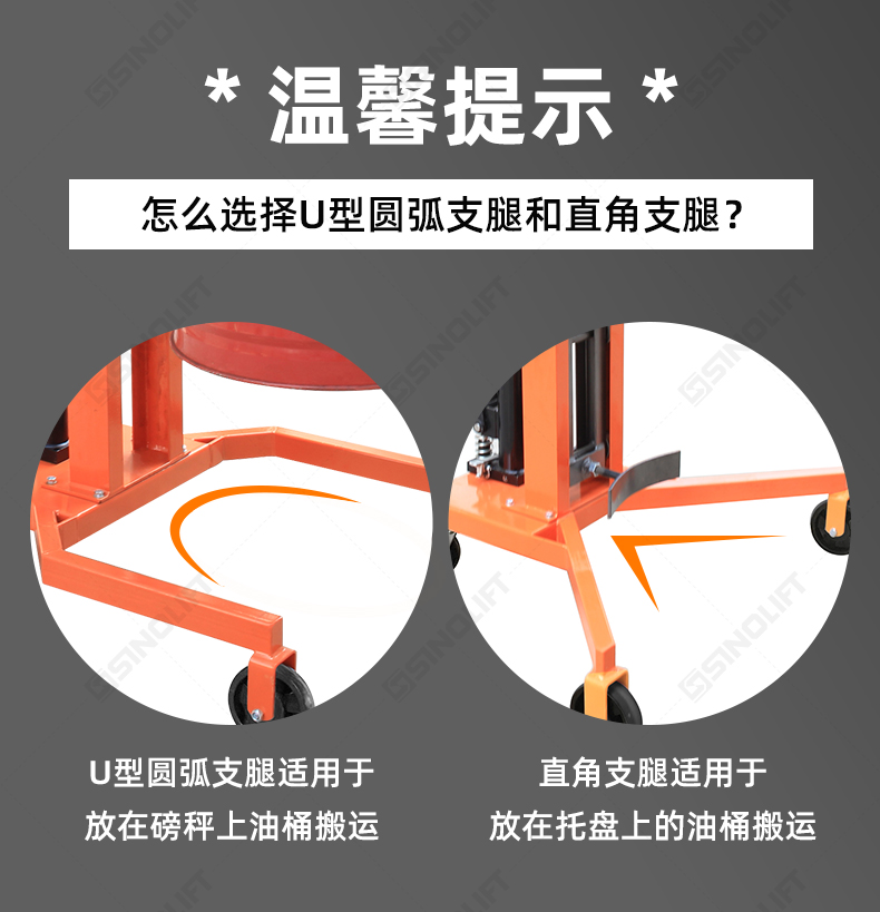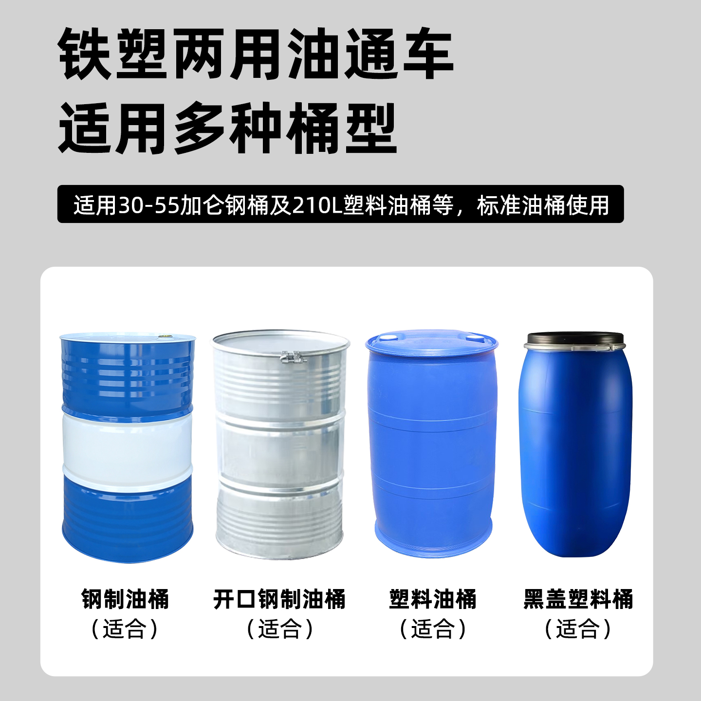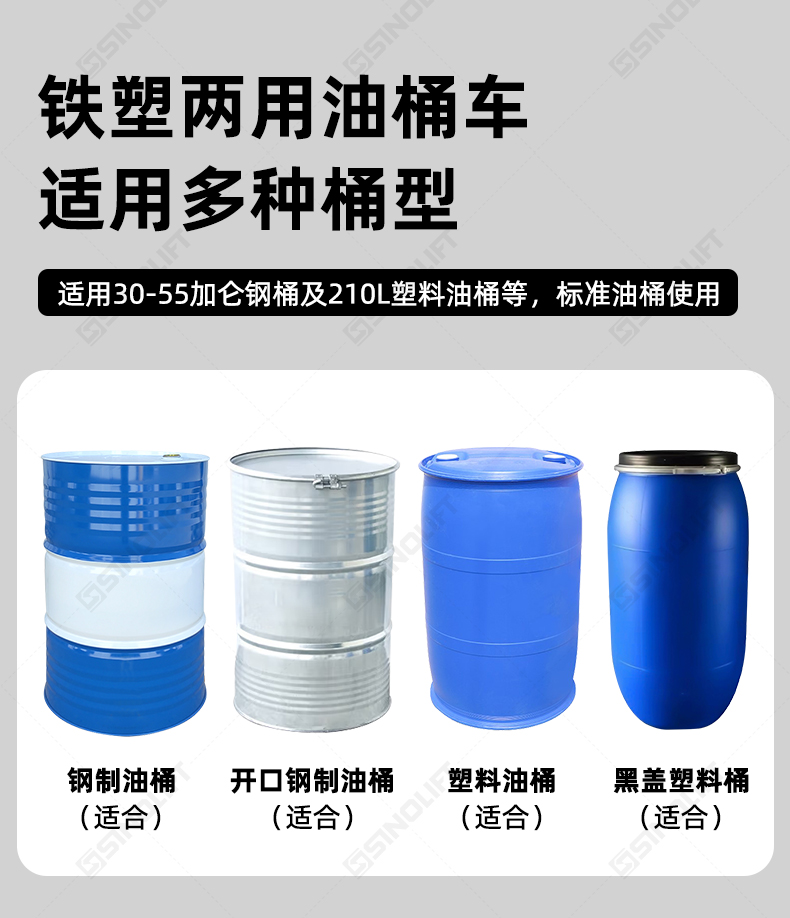 铁塑两用油桶车适用多种桶型,适用30-55加仑钢桶及210L塑料油桶等,标准油桶使用