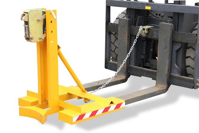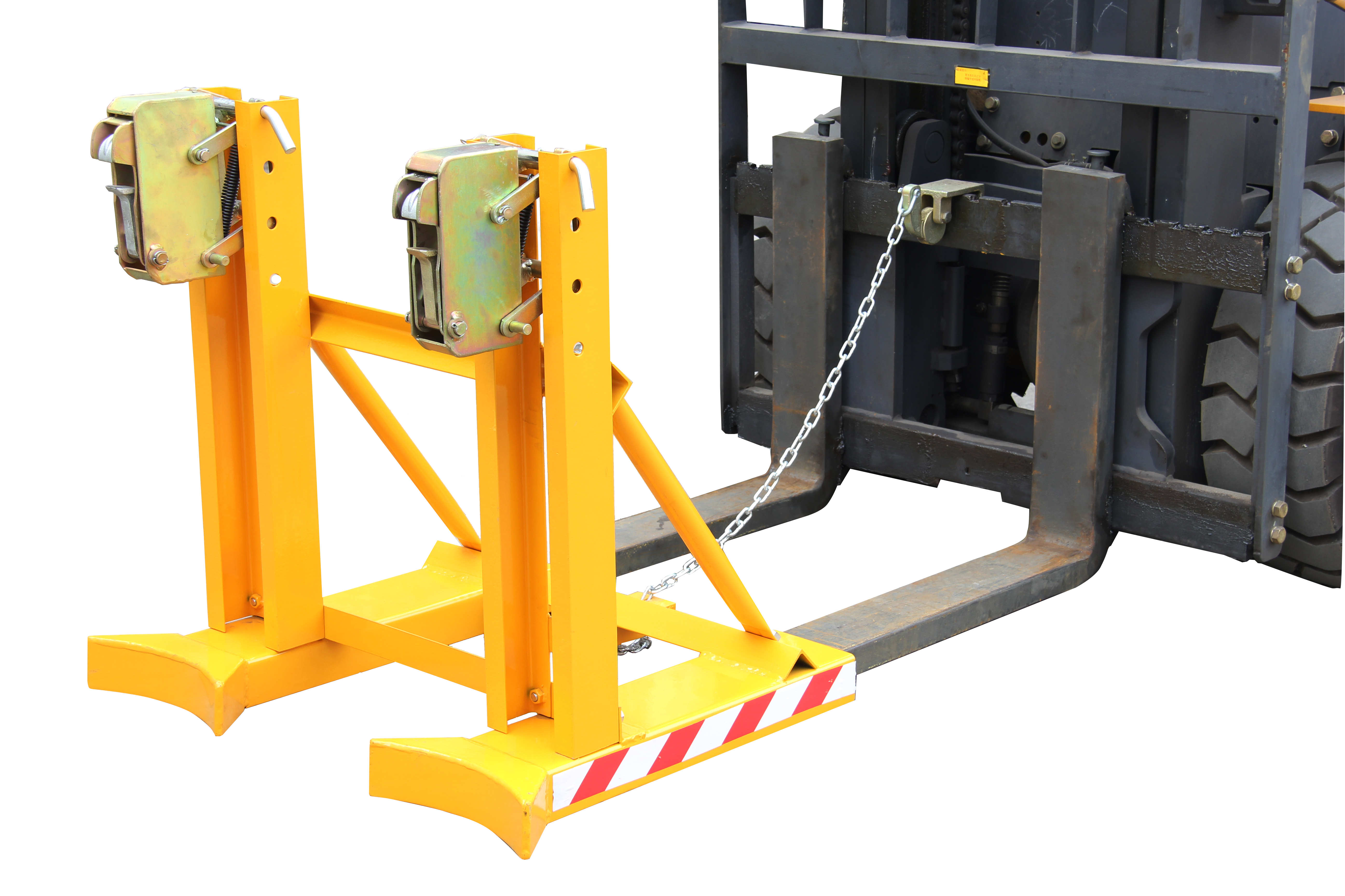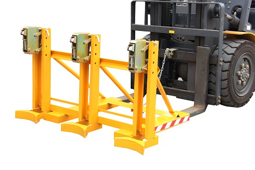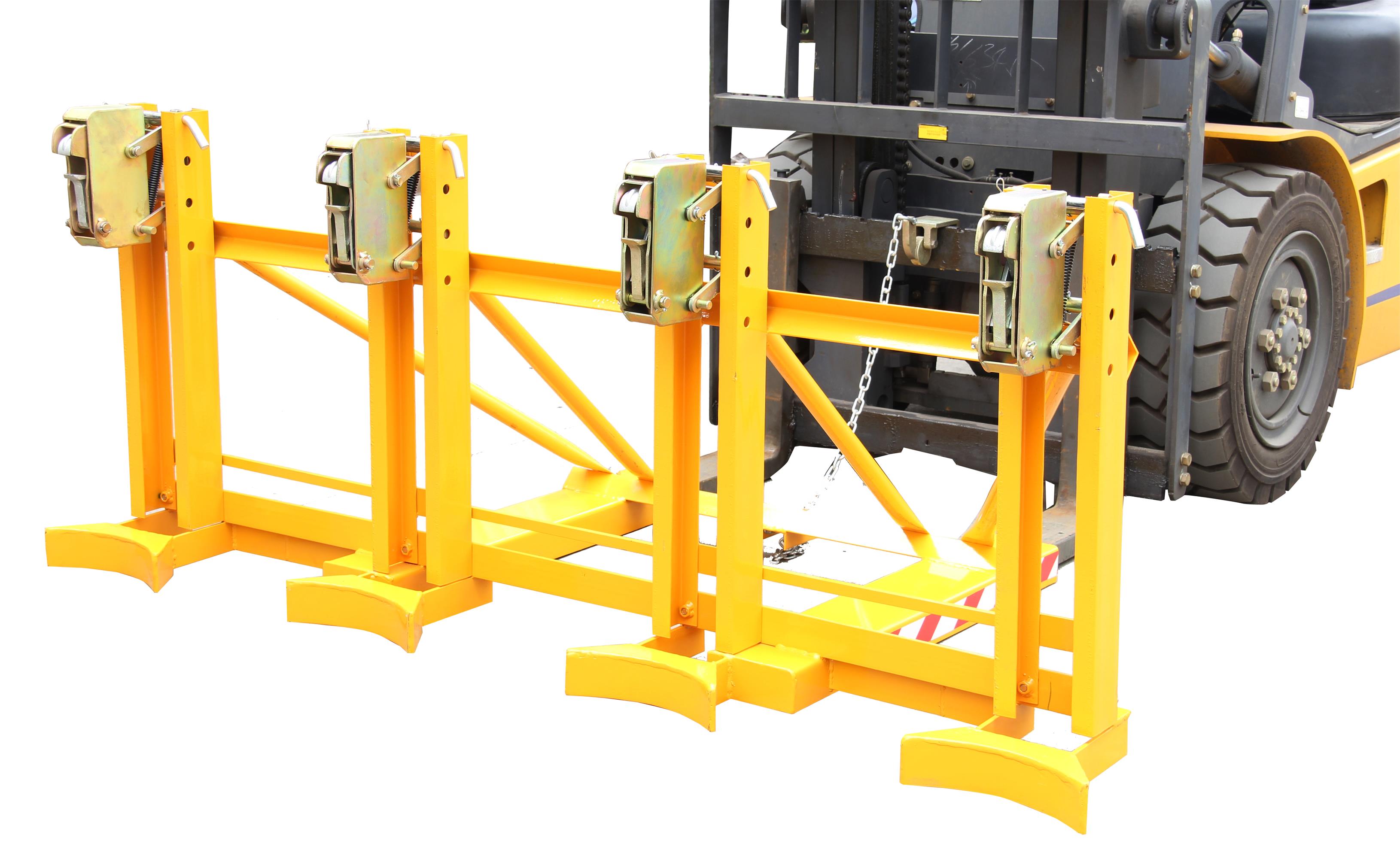 1. 纯机械结构设计的重型双桶夹具可与叉车方便地配合,仅依靠叉车的动作,不需要其它动力,可自动一次搬运2个桶。