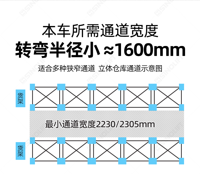 | 通道宽度:800X1200托盘(1200沿货叉位置) | mm | 2305 | |