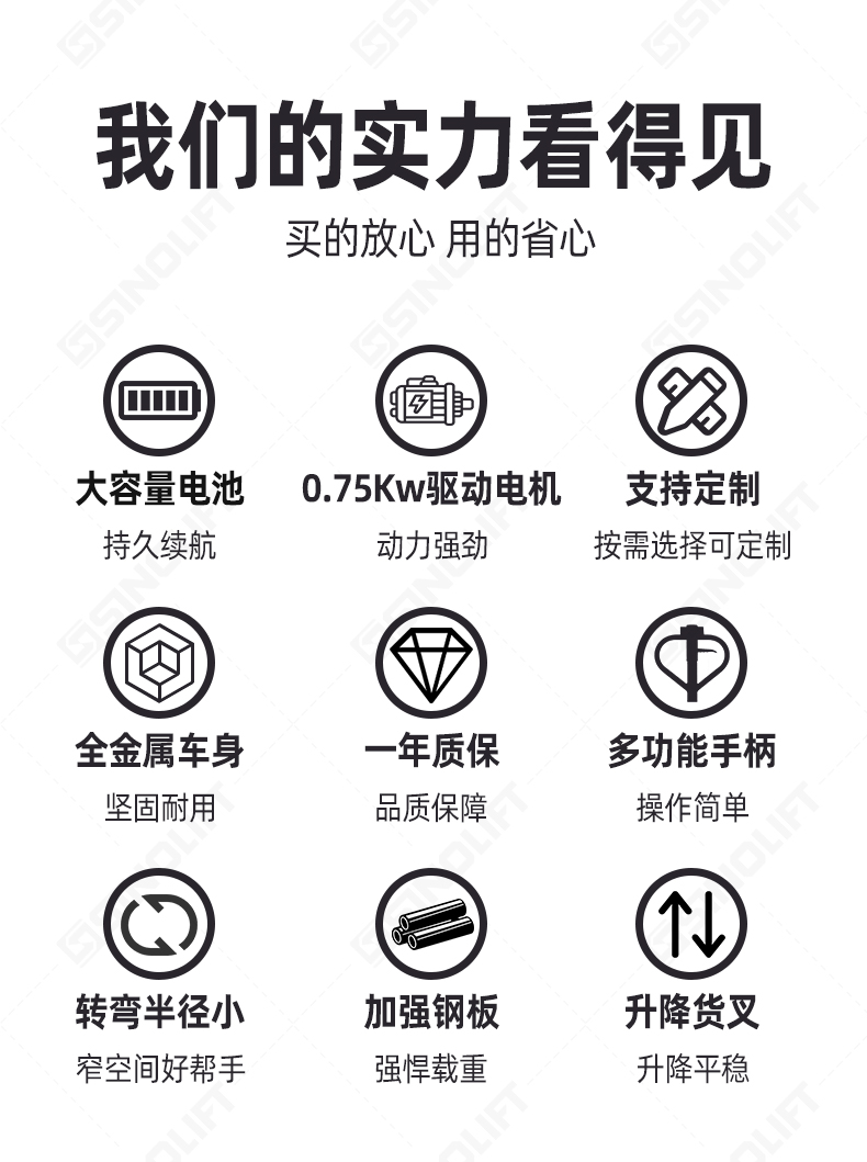 6.整车小巧灵活,转弯半径小,适用于箱式货车等狭窄通道作业;