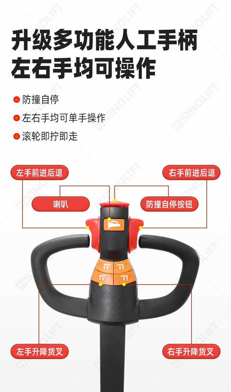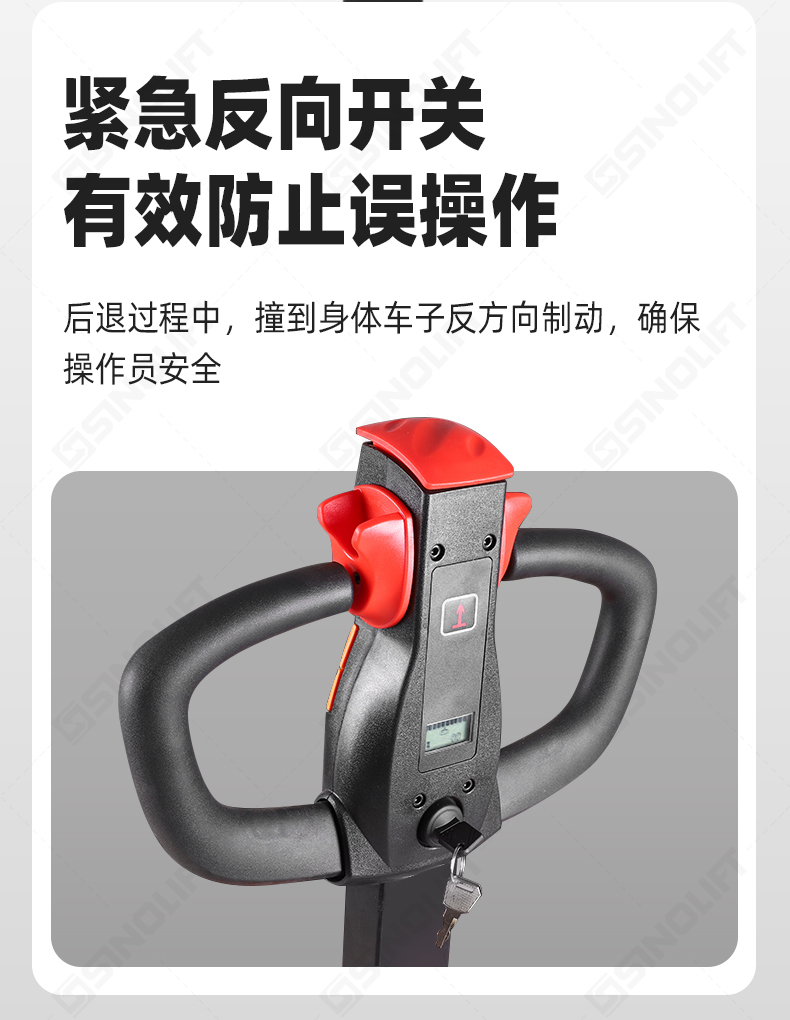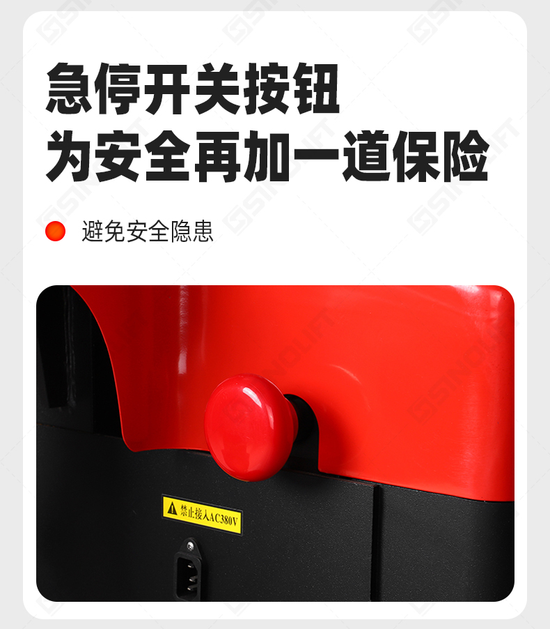 2.标配急停开关,紧急反向装置,外置充电器;
