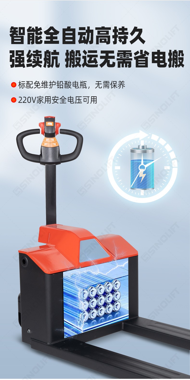5.可配免维护铅酸电池和磷酸铁锂电池,寿命长,免维护,更换便捷,续航无限;