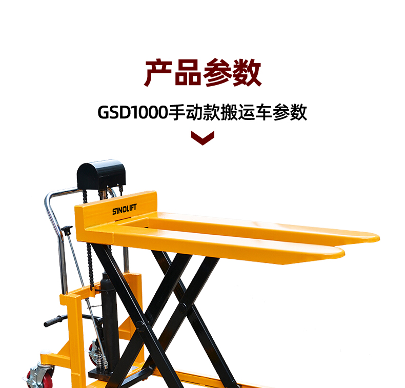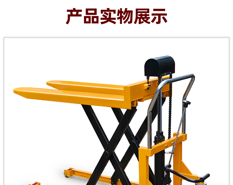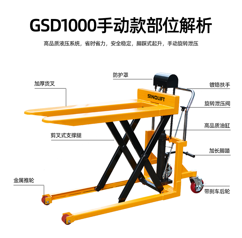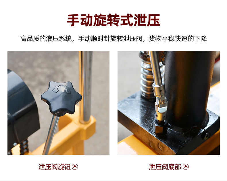 采用高品质的液压系统,手动顺时针旋转泄压阀,货物平稳快速的下降