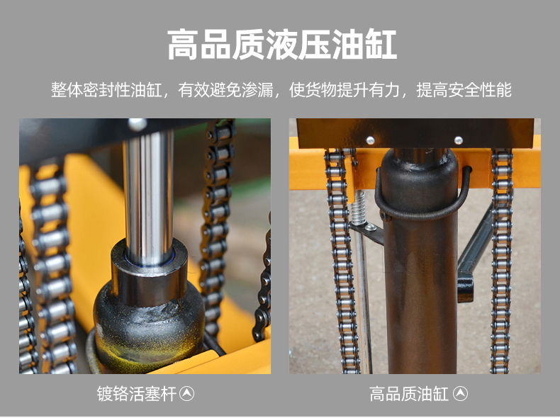 高品质液压油缸,整体密封有效避免渗漏,使货物提升有力,提高安全性能