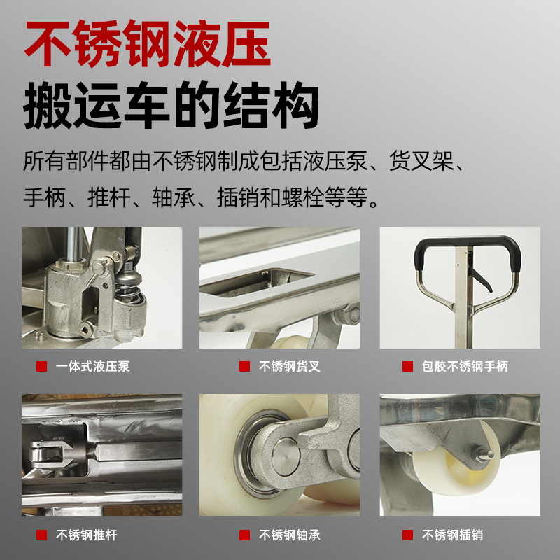 整车采用304号不锈钢钢材铸造,防水防锈,液压集成一体式设计,进口密封圈,防漏可靠;