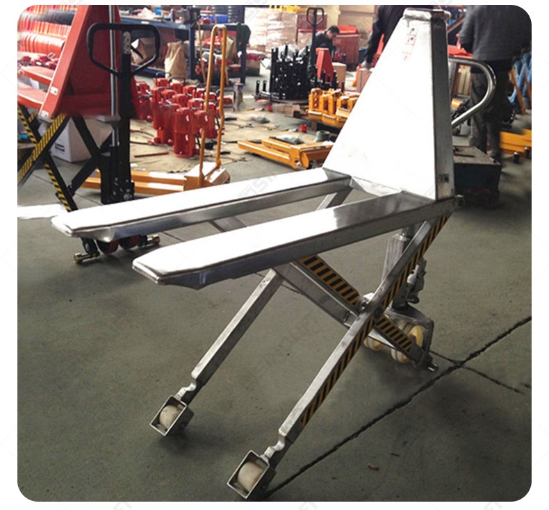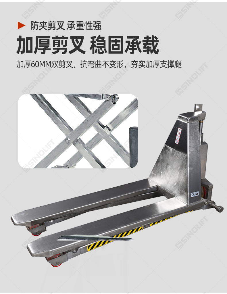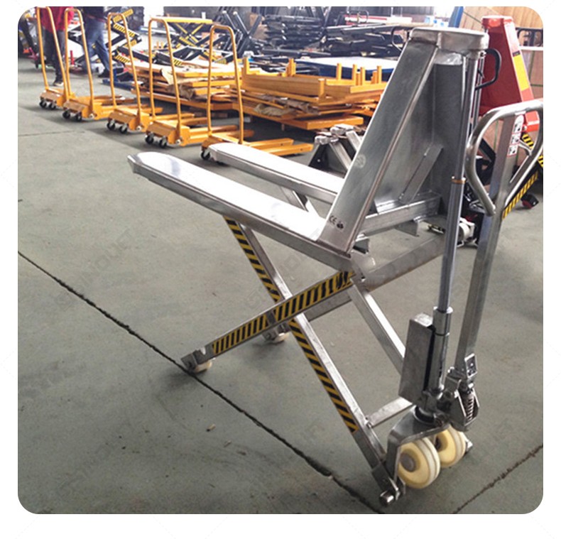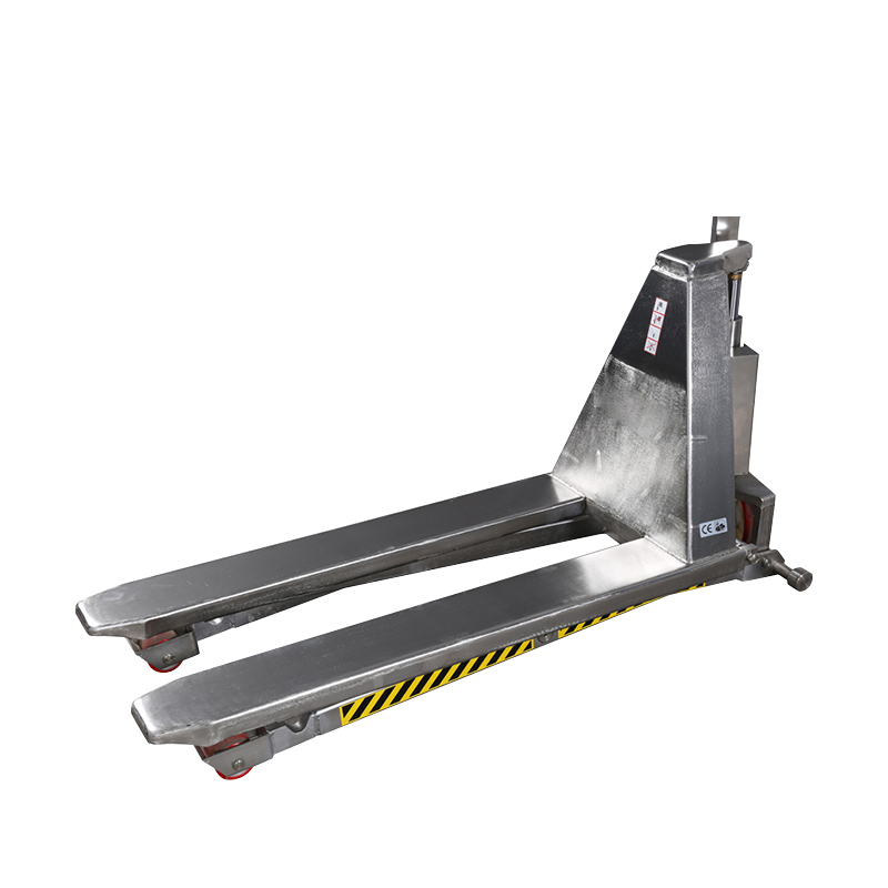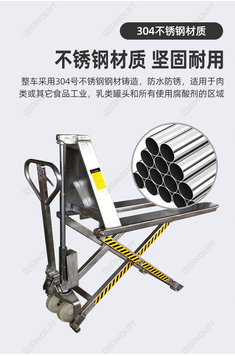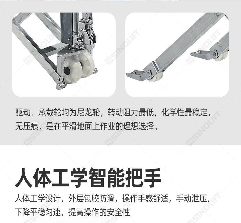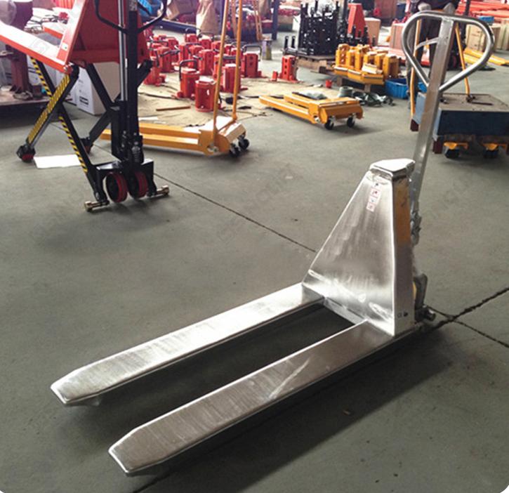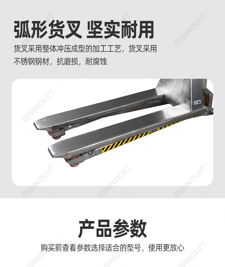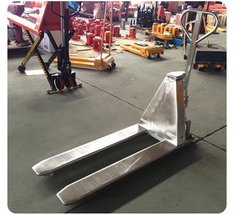 所有零部件材质都为不锈钢,包括液压泵,货叉框架,手柄,推杆,轴承,销和螺栓,等等。