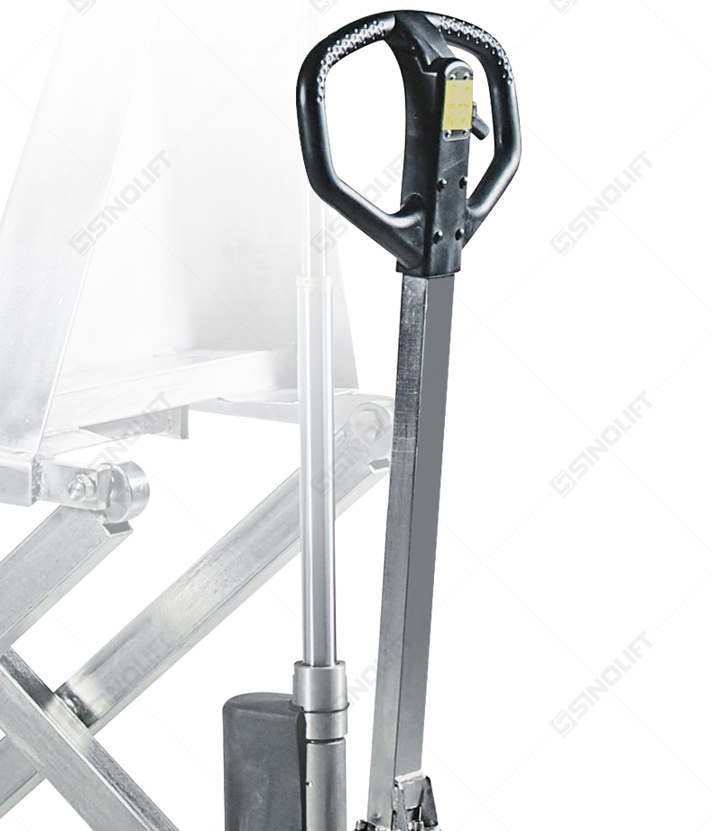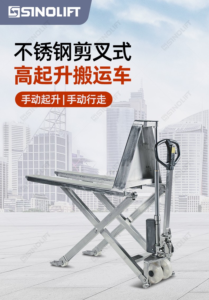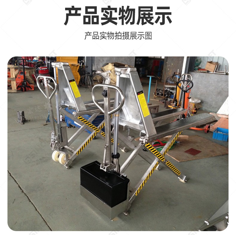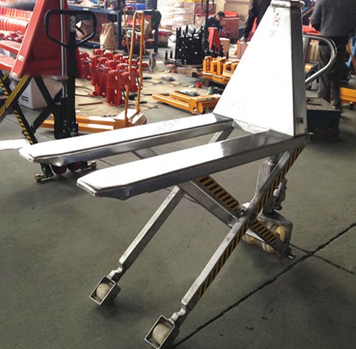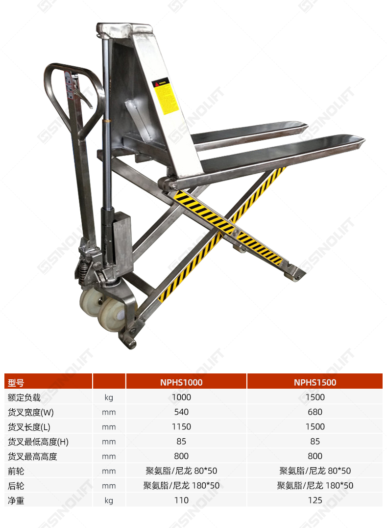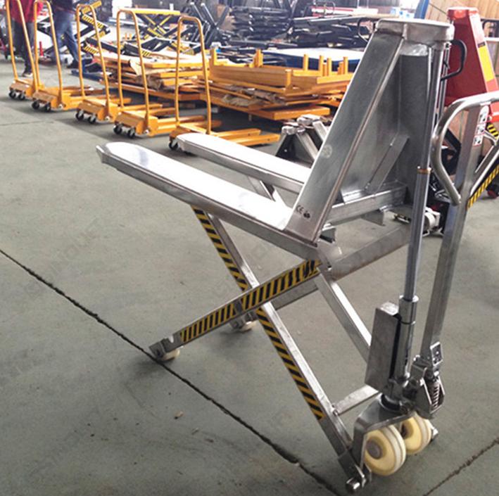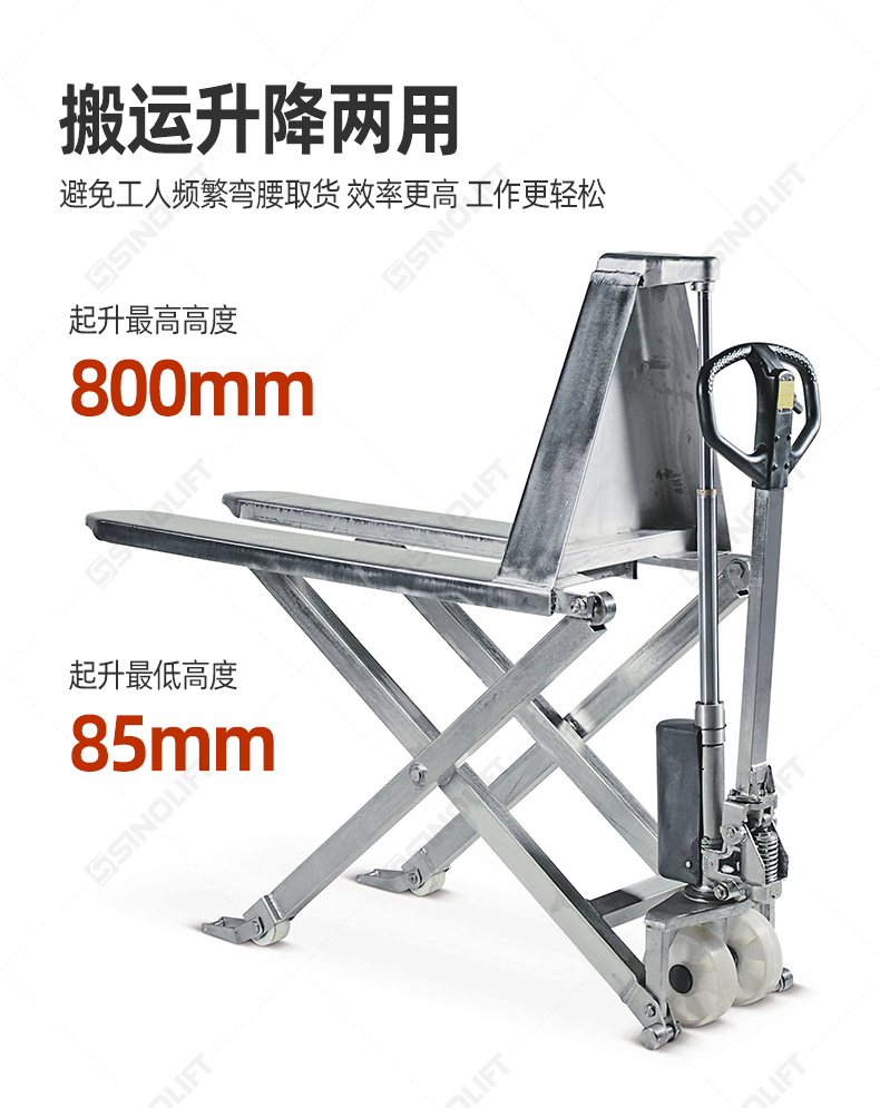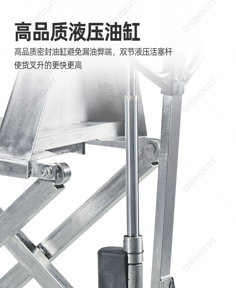 所有零部件材质都为不锈钢,包括液压泵,货叉框架,手柄,推杆,轴承,销和螺栓,等等。