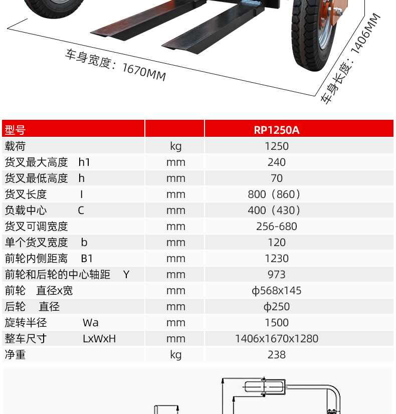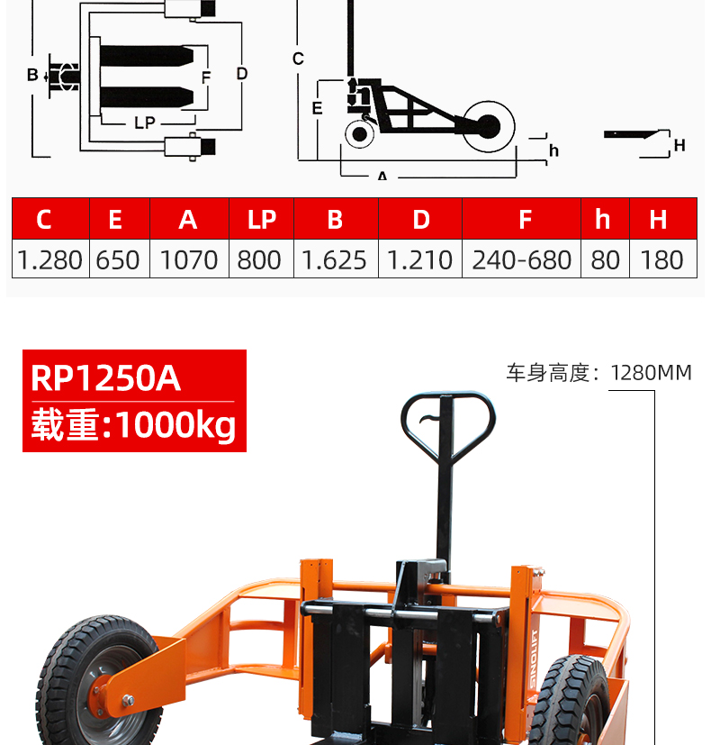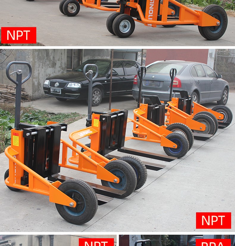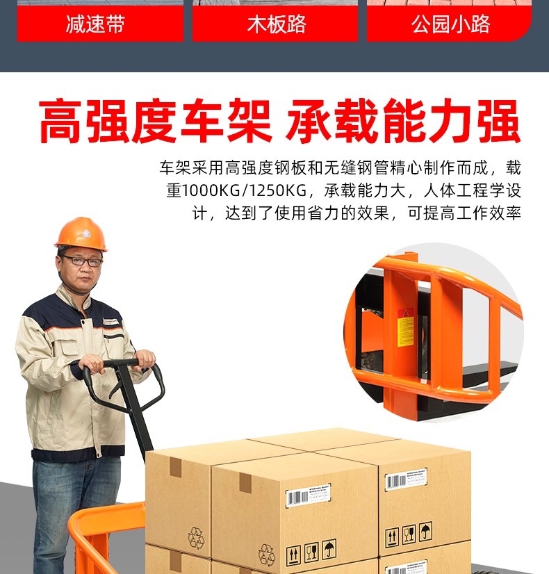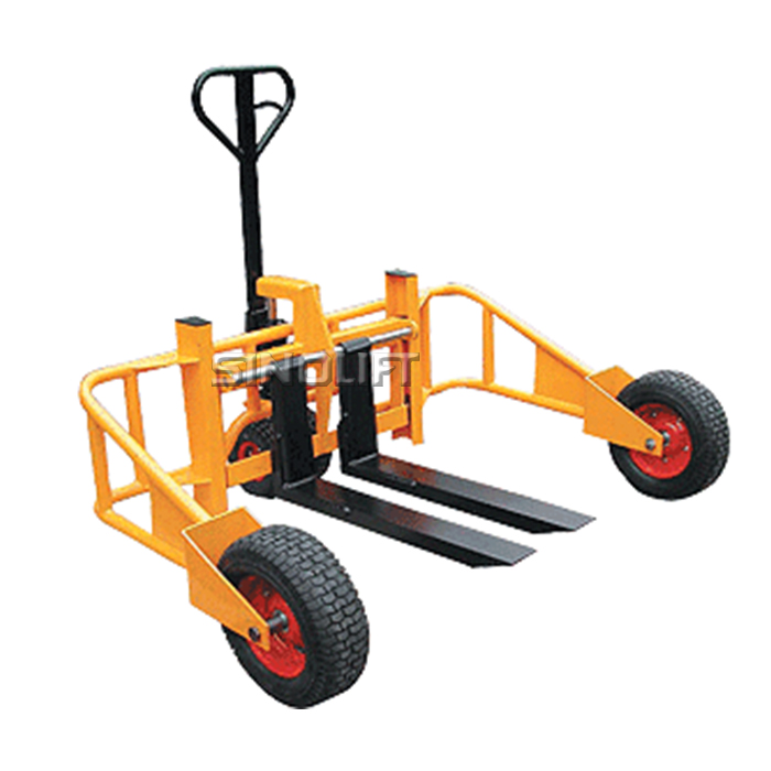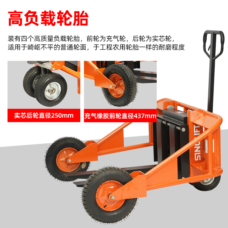 • 大型轮胎和支腿设计可用于任何类型托盘在不平地面上的搬运