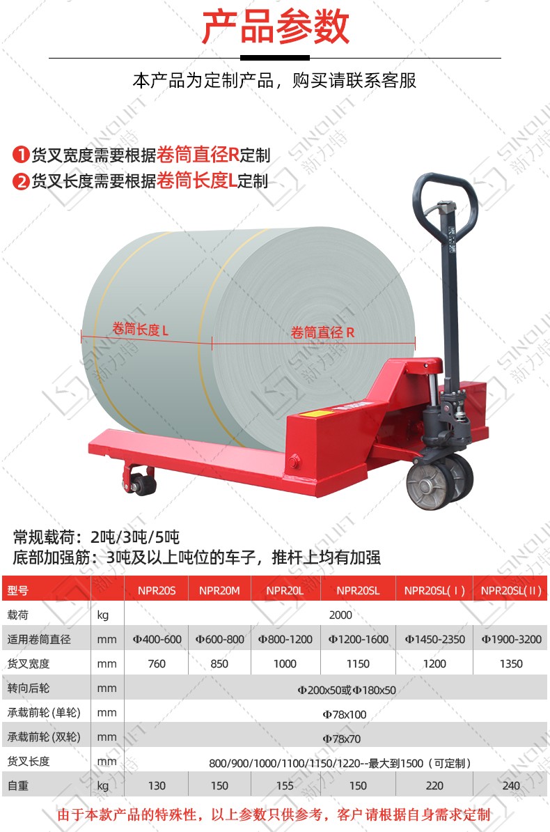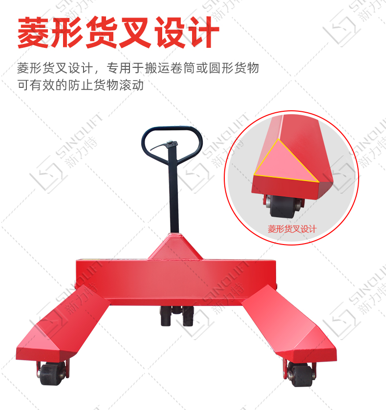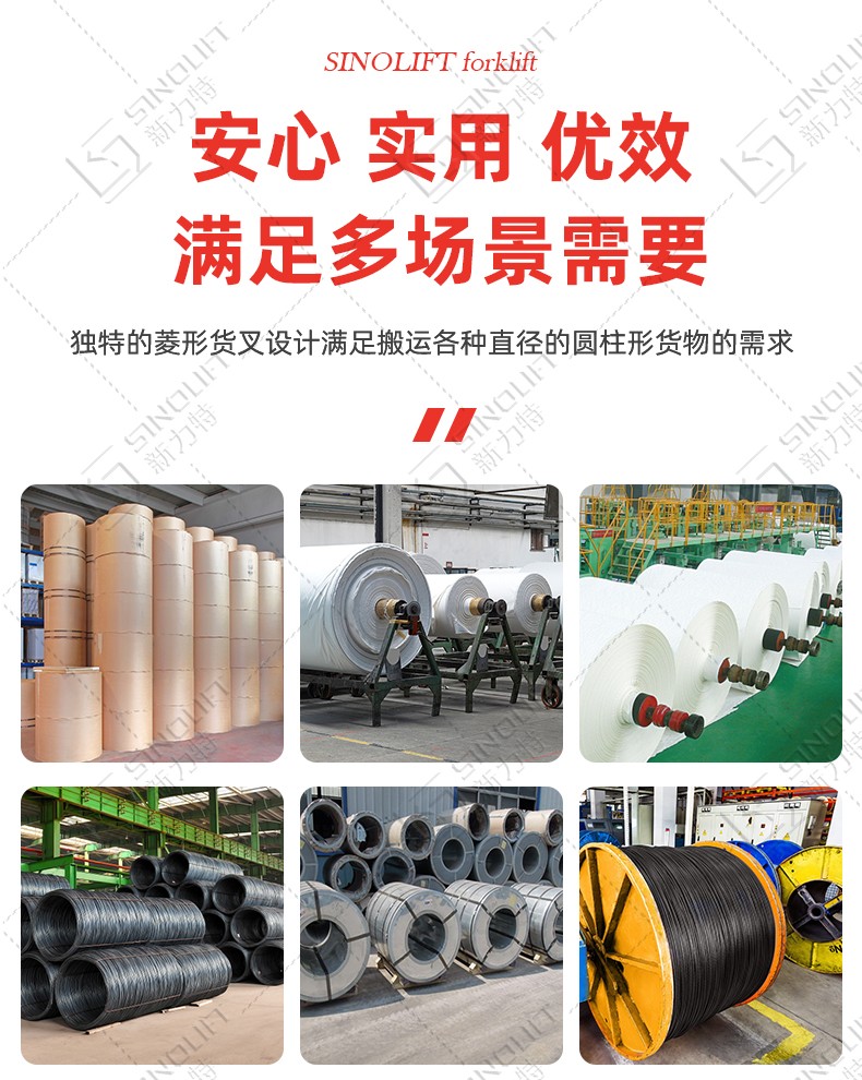 菱形货叉设计,用于搬运各种直径的圆柱形货物常用于造纸、印刷、包装、纺织、