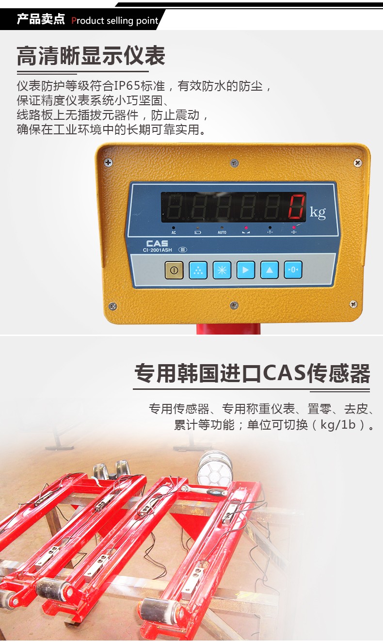 专用韩国进口CAS传感器、称重仪表、置零、去皮:累计等功能;单位可切换(kg/1b)。