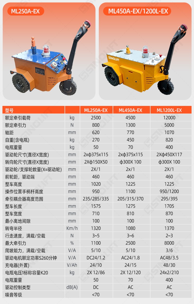 名称:步行式防爆电动牵引大载重ML250A-EX ML450A-EX ML1200L-EX