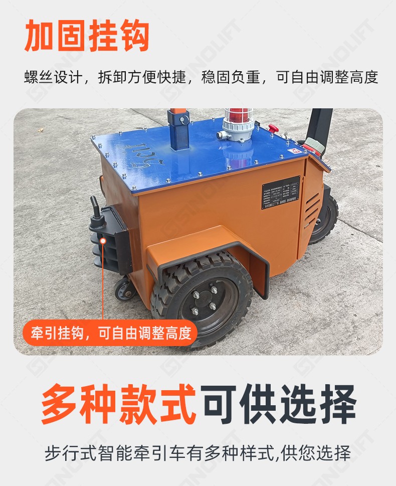 步行式智能牵引车有多种样式,供您选择,更有多种款式挂具可选。