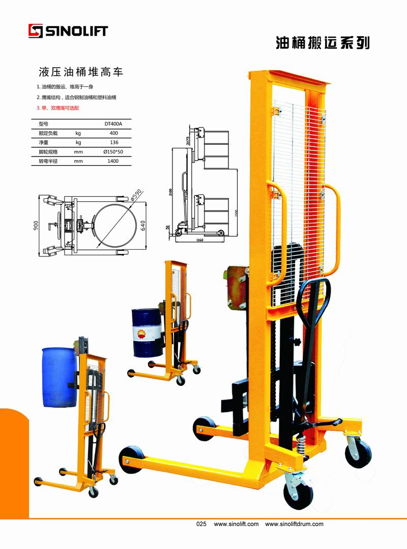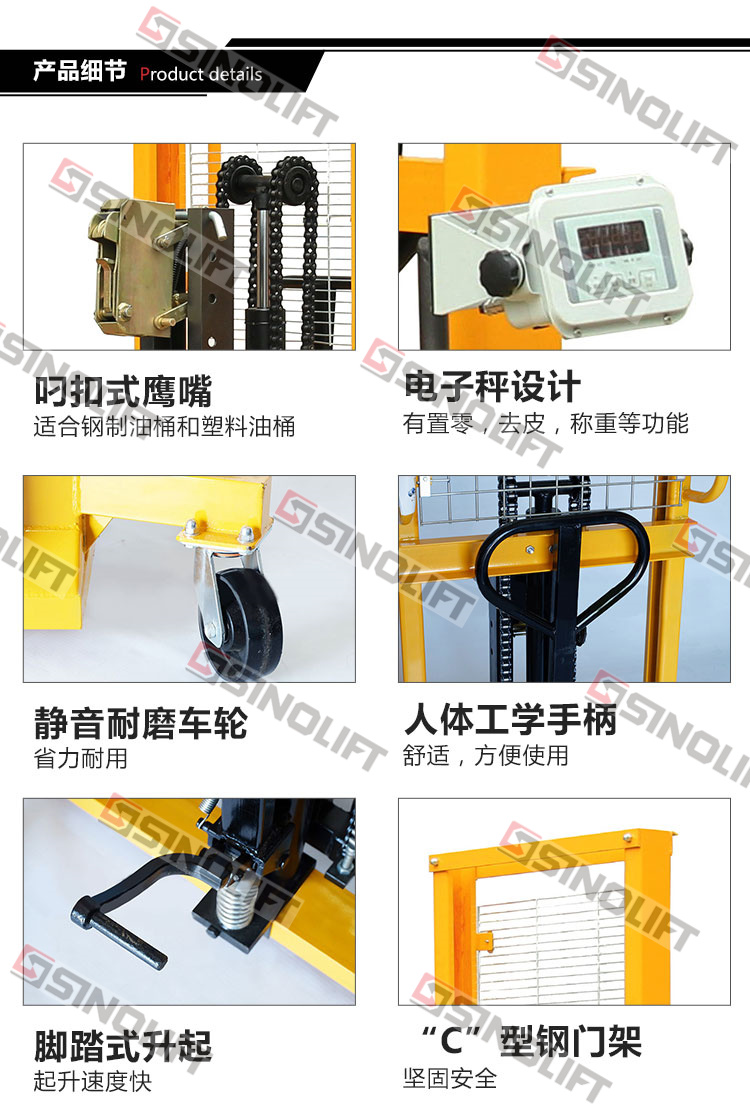 4.适合水平方向的钢制油桶的搬运和堆高。