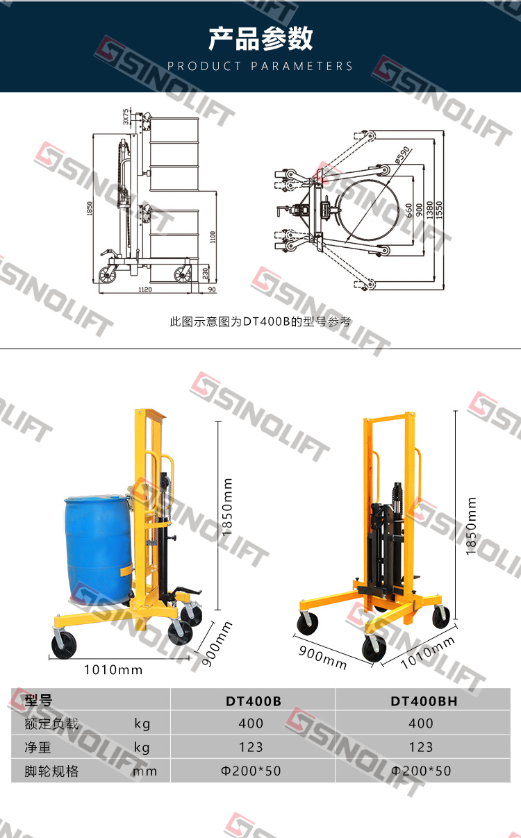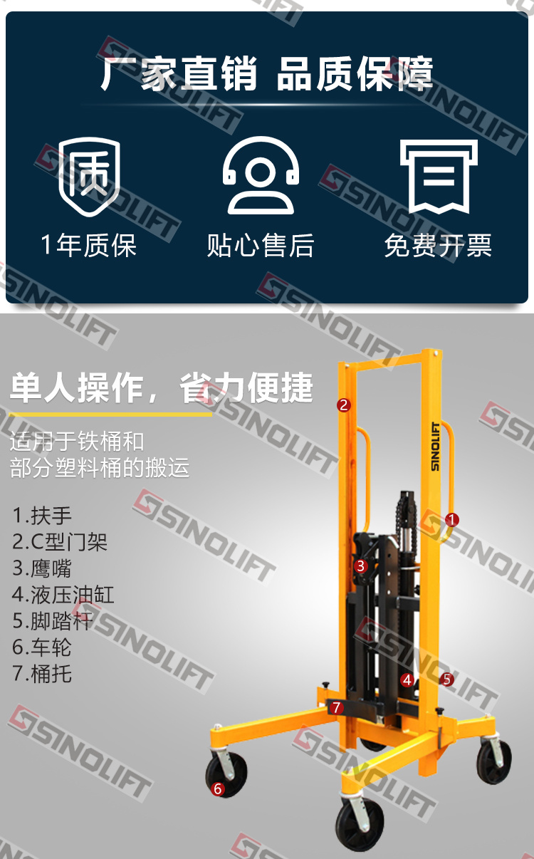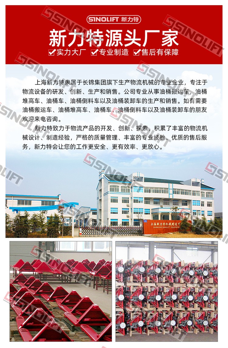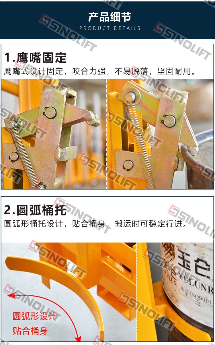 4.适合水平方向的钢制油桶的搬运和堆高。