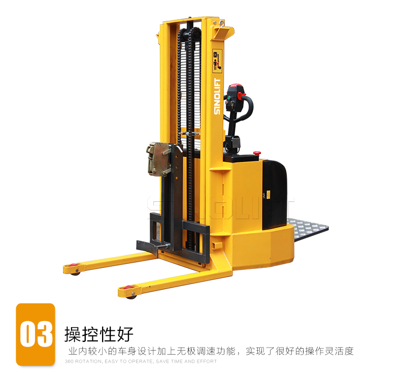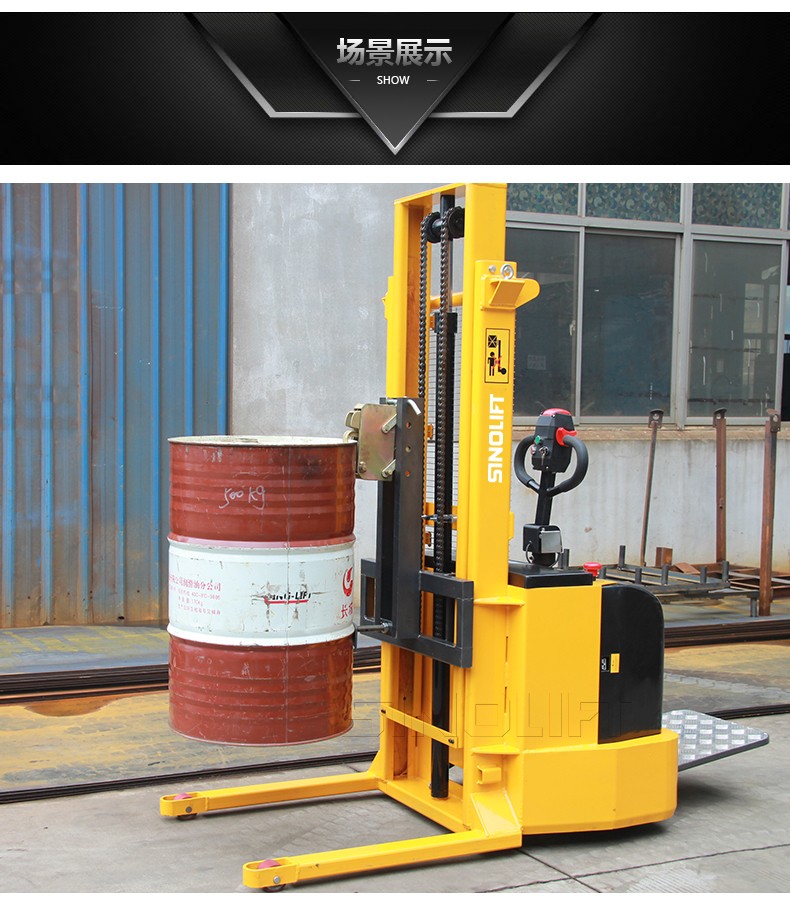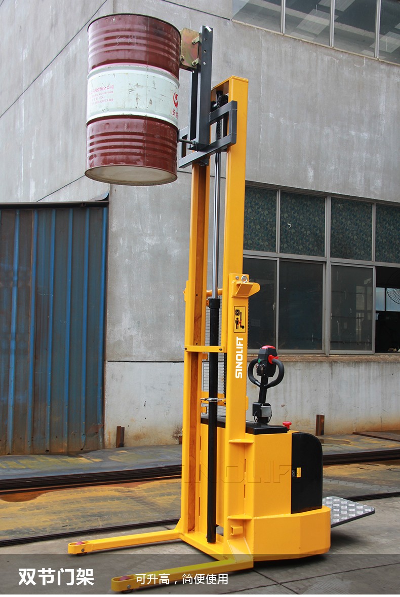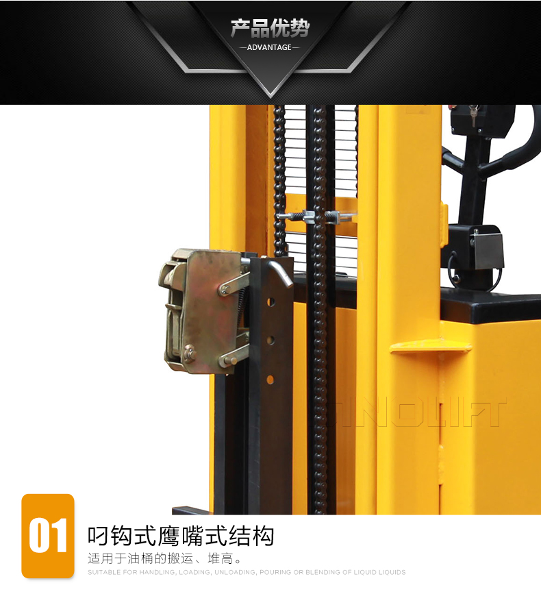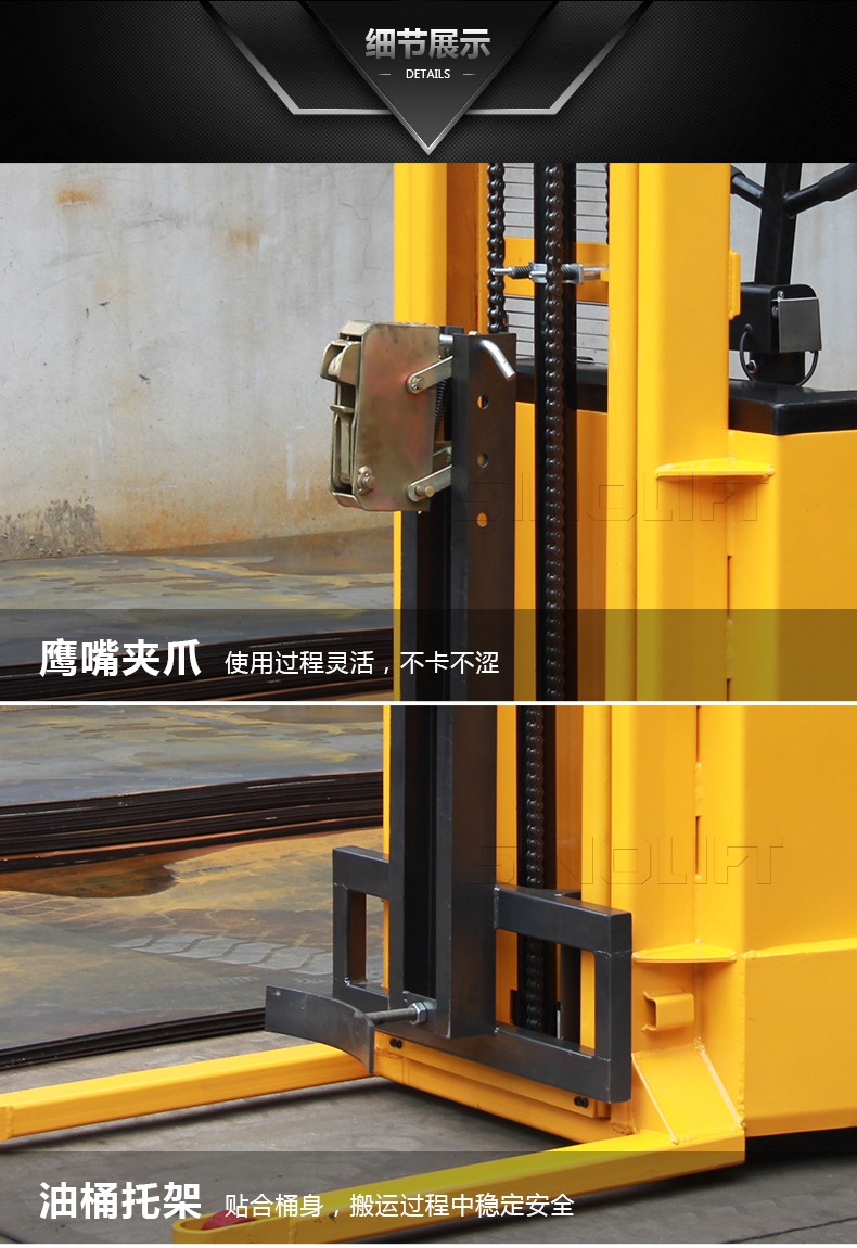 1.叼扣式鹰嘴结构,适用于铁桶类的搬运、提升、装卸作业,采用进口电动车专用行走控制系统,行走稳定,具有轻便、灵活的特性,单人操作。