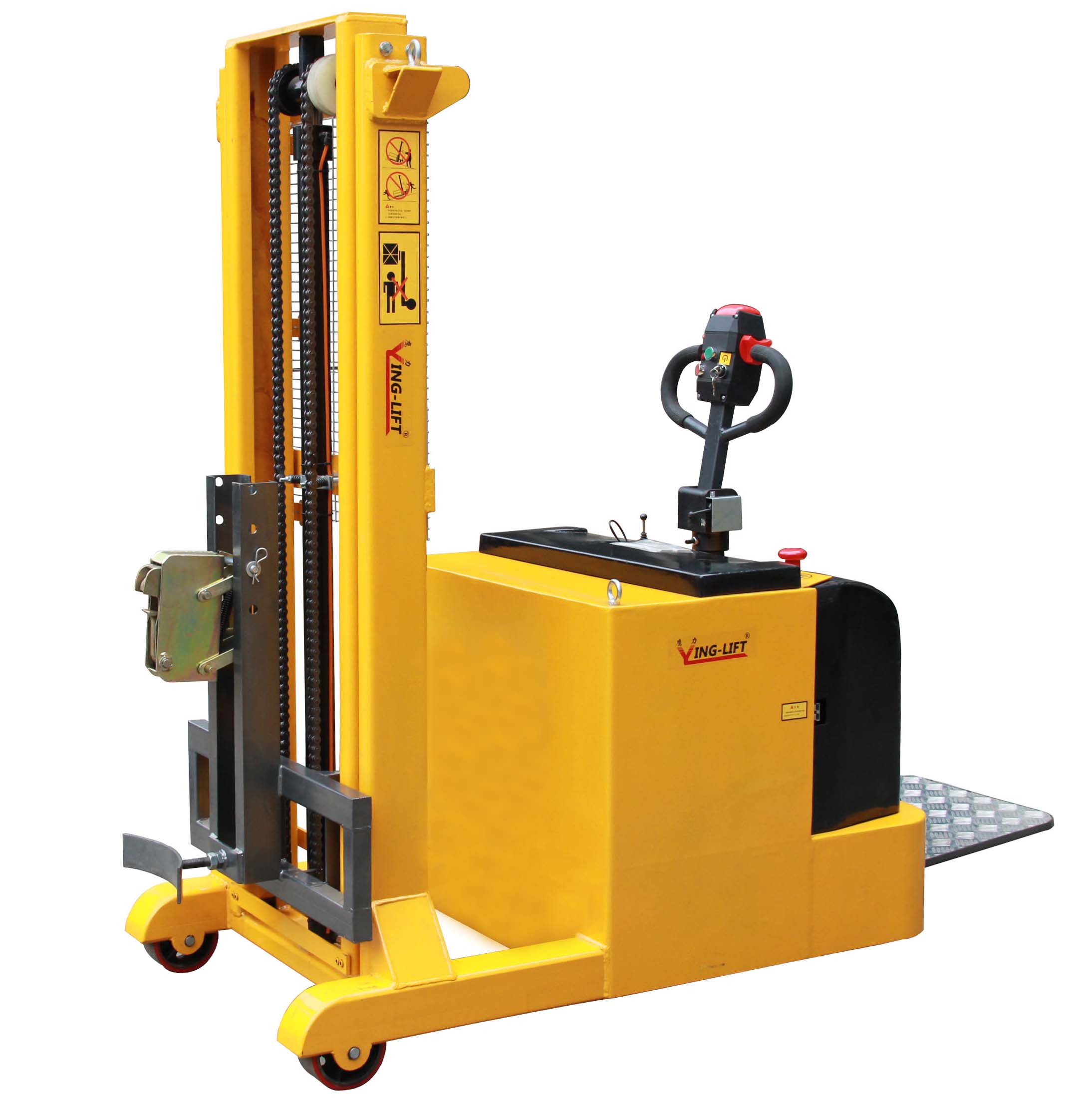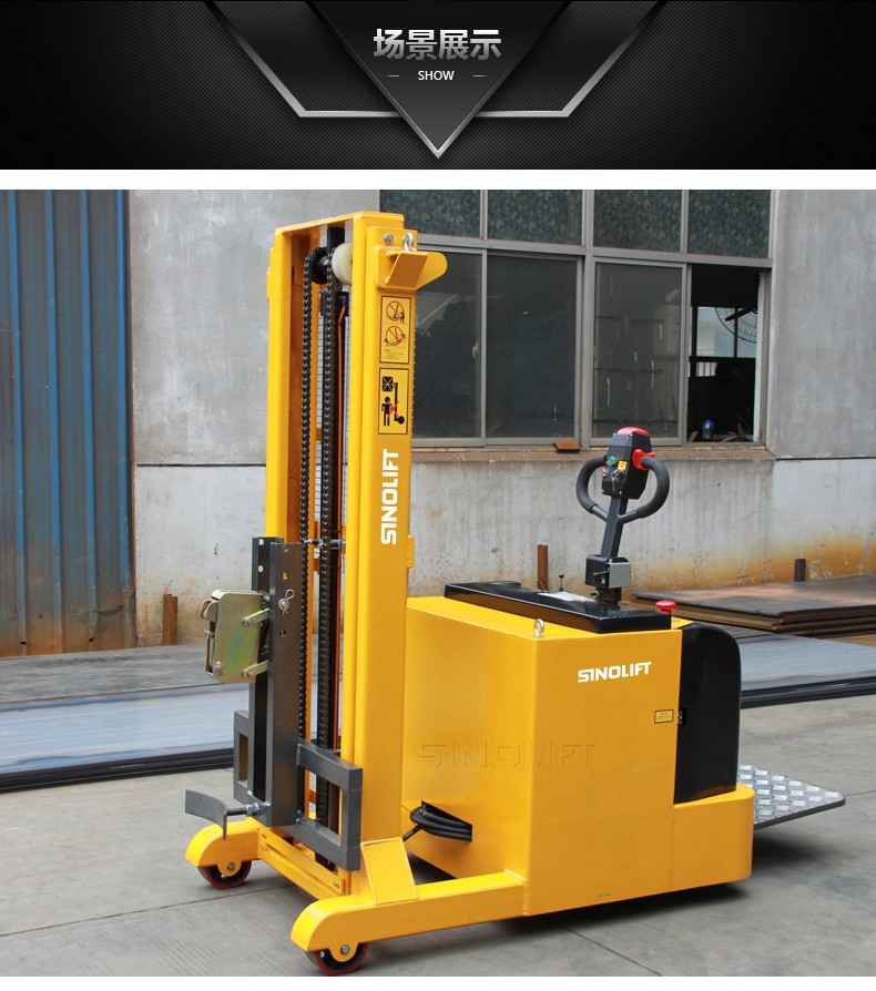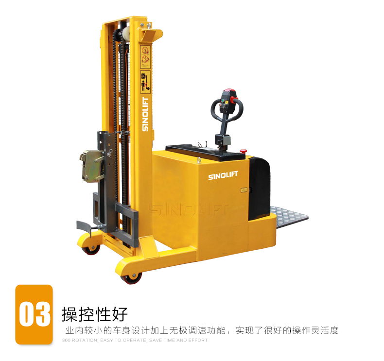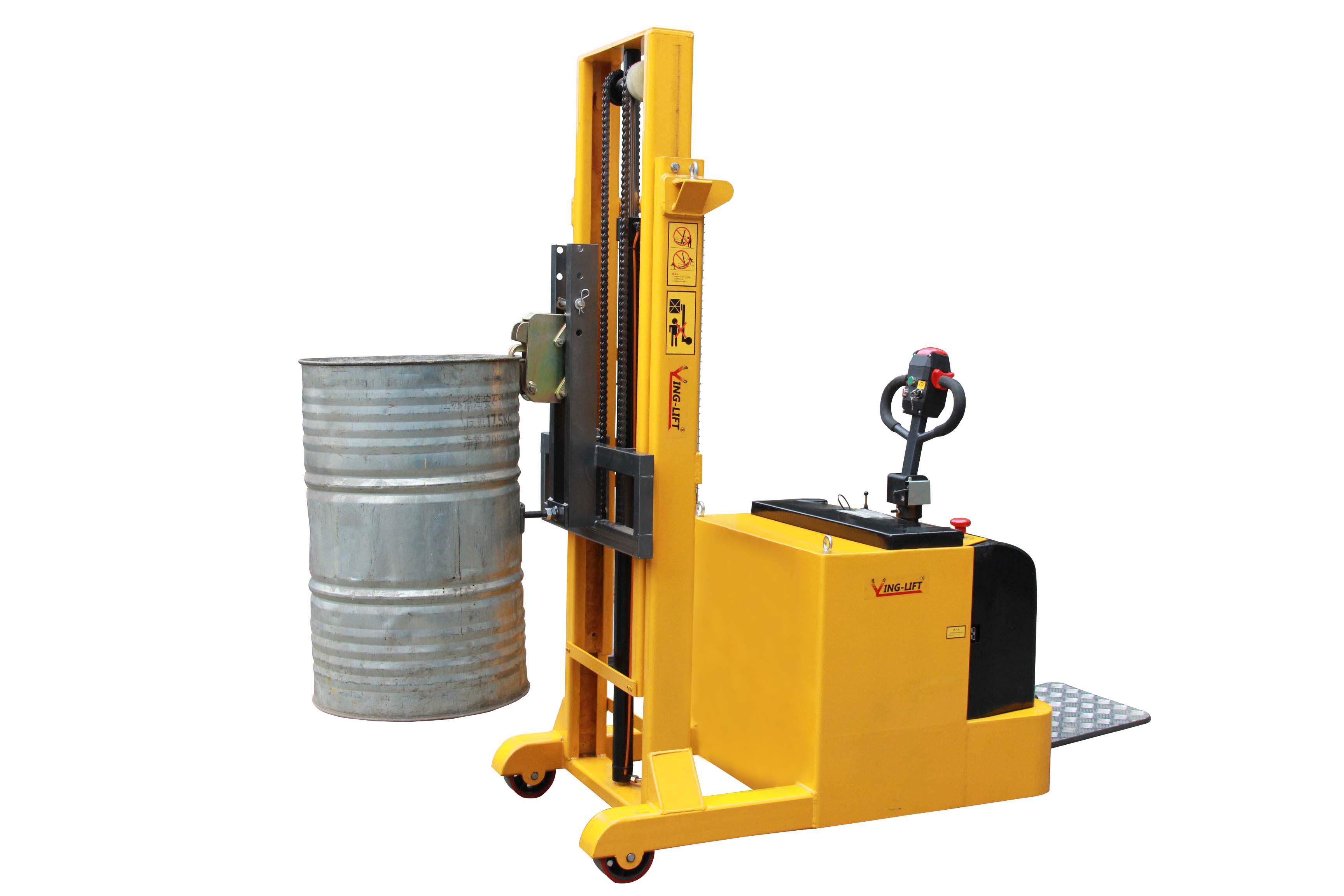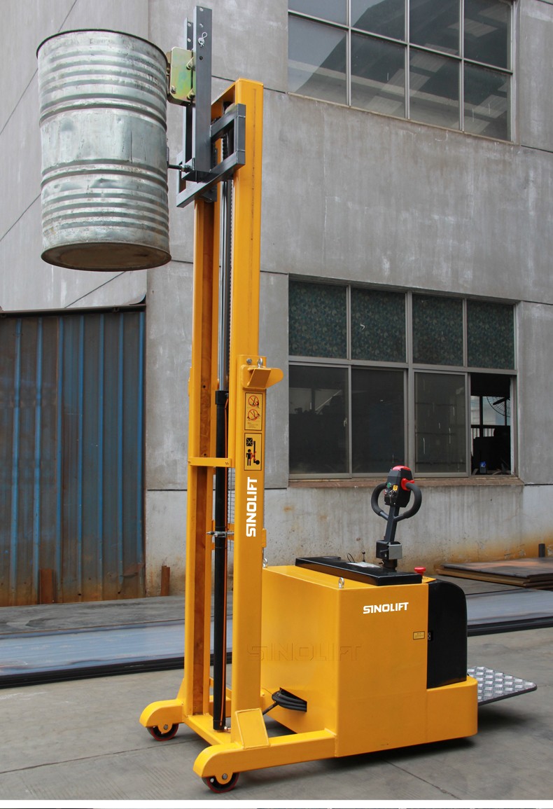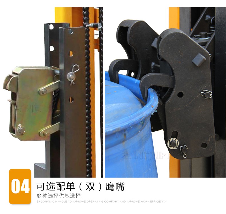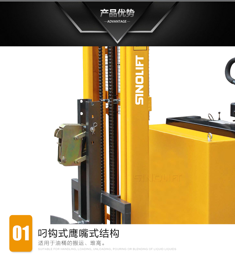 1.叼口式鹰嘴结构,适用于钢桶类的搬运、提升、装卸作业,采用进口电动车专用行走控制系统,行走稳定,具有轻便、灵活的特性,单人操作。