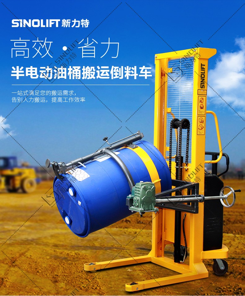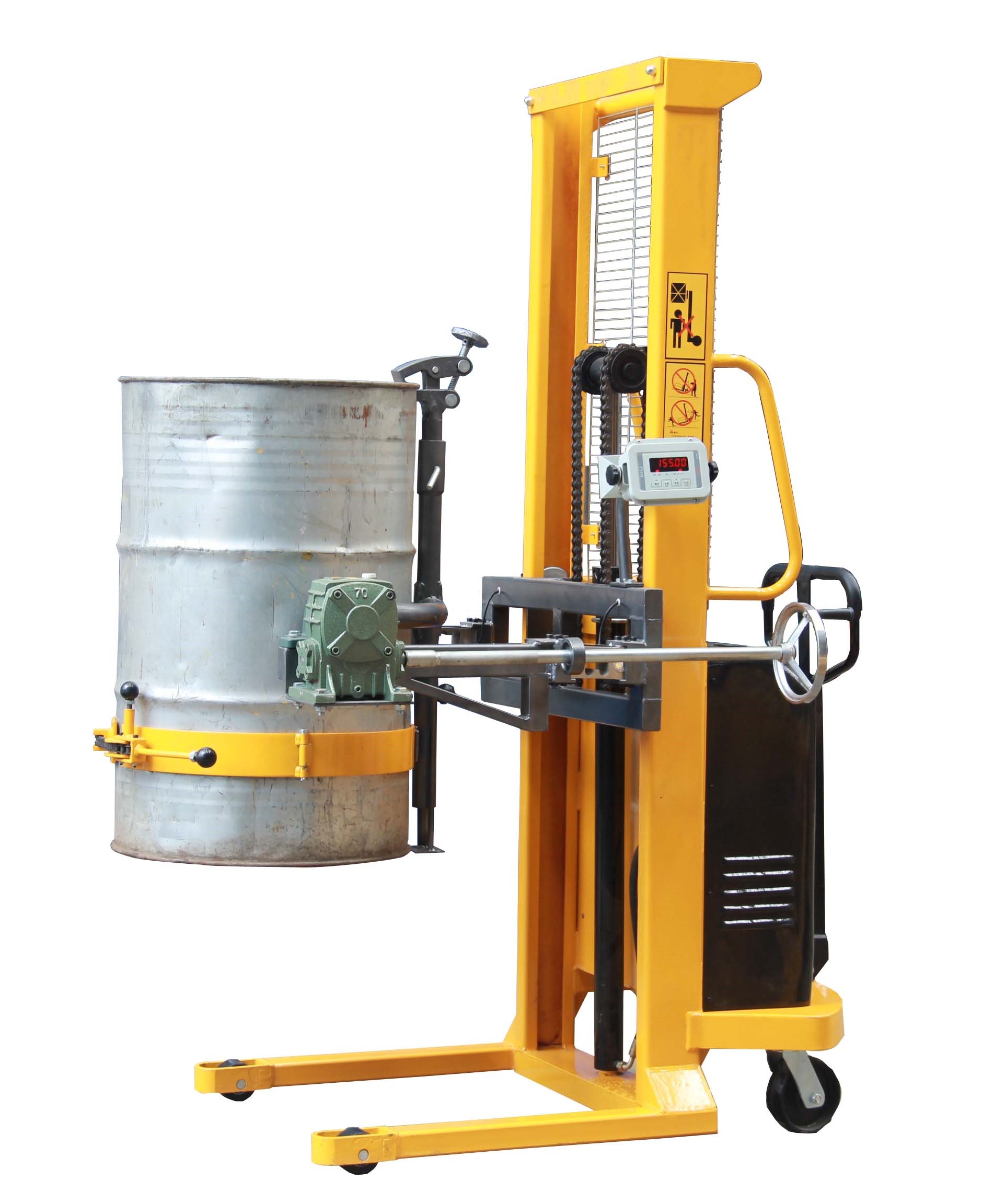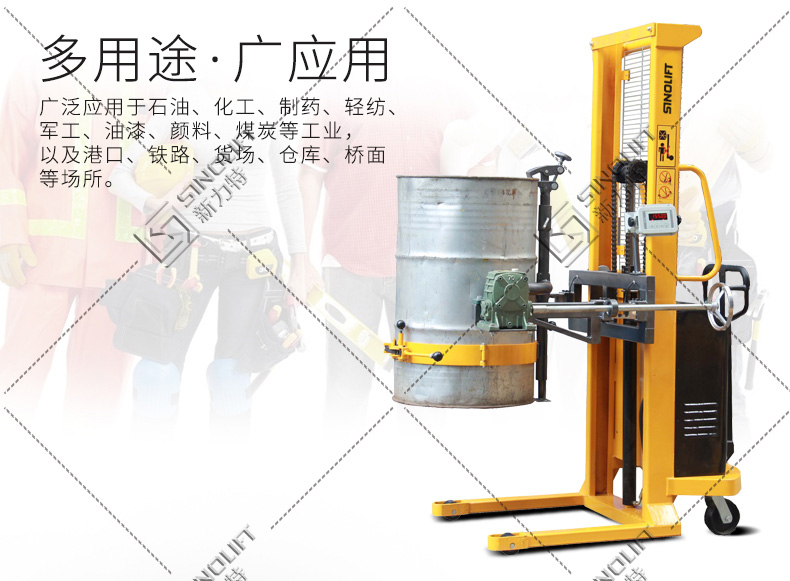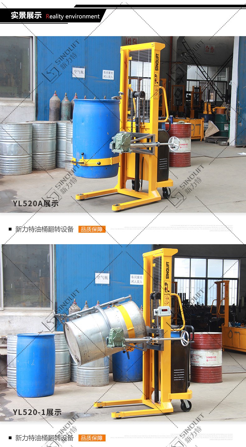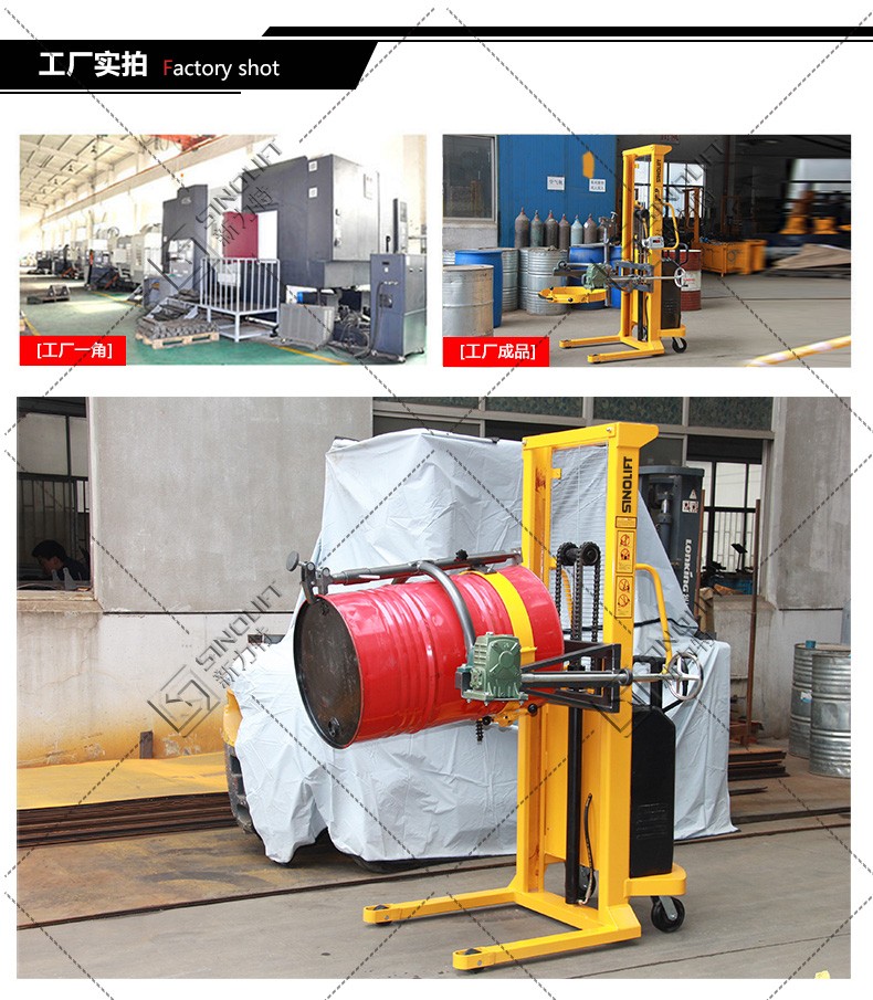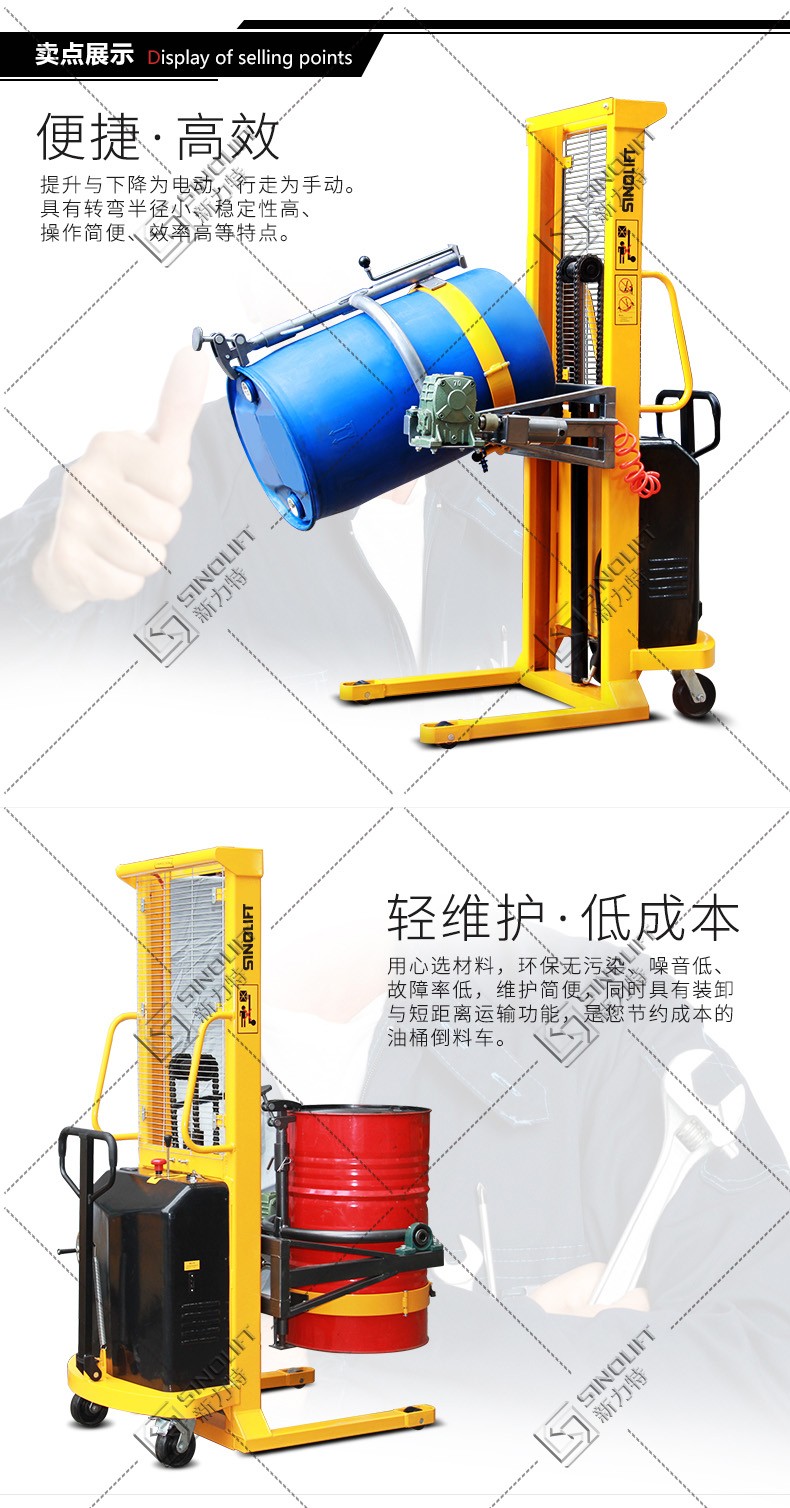 1、油桶翻转车设计结构简单轻巧,电动180度翻转,操作简便省力。