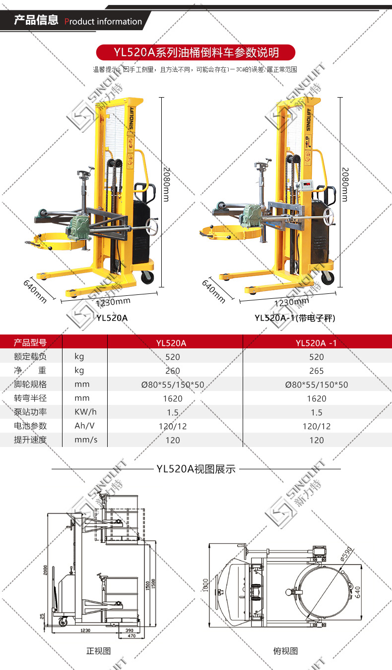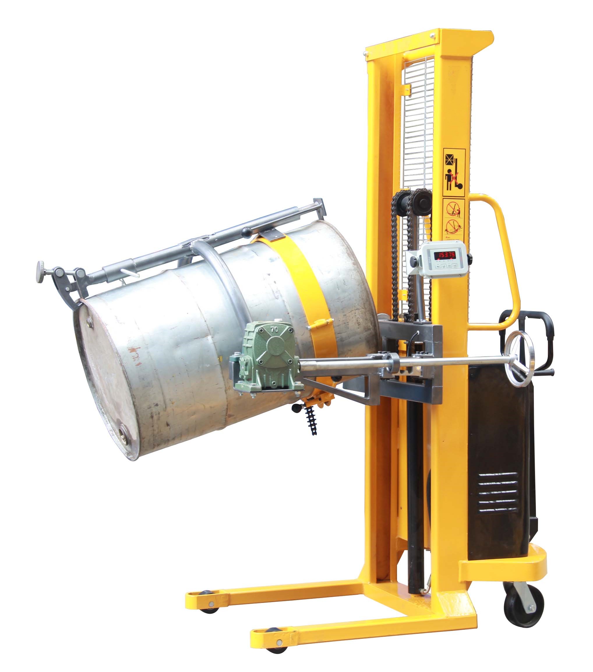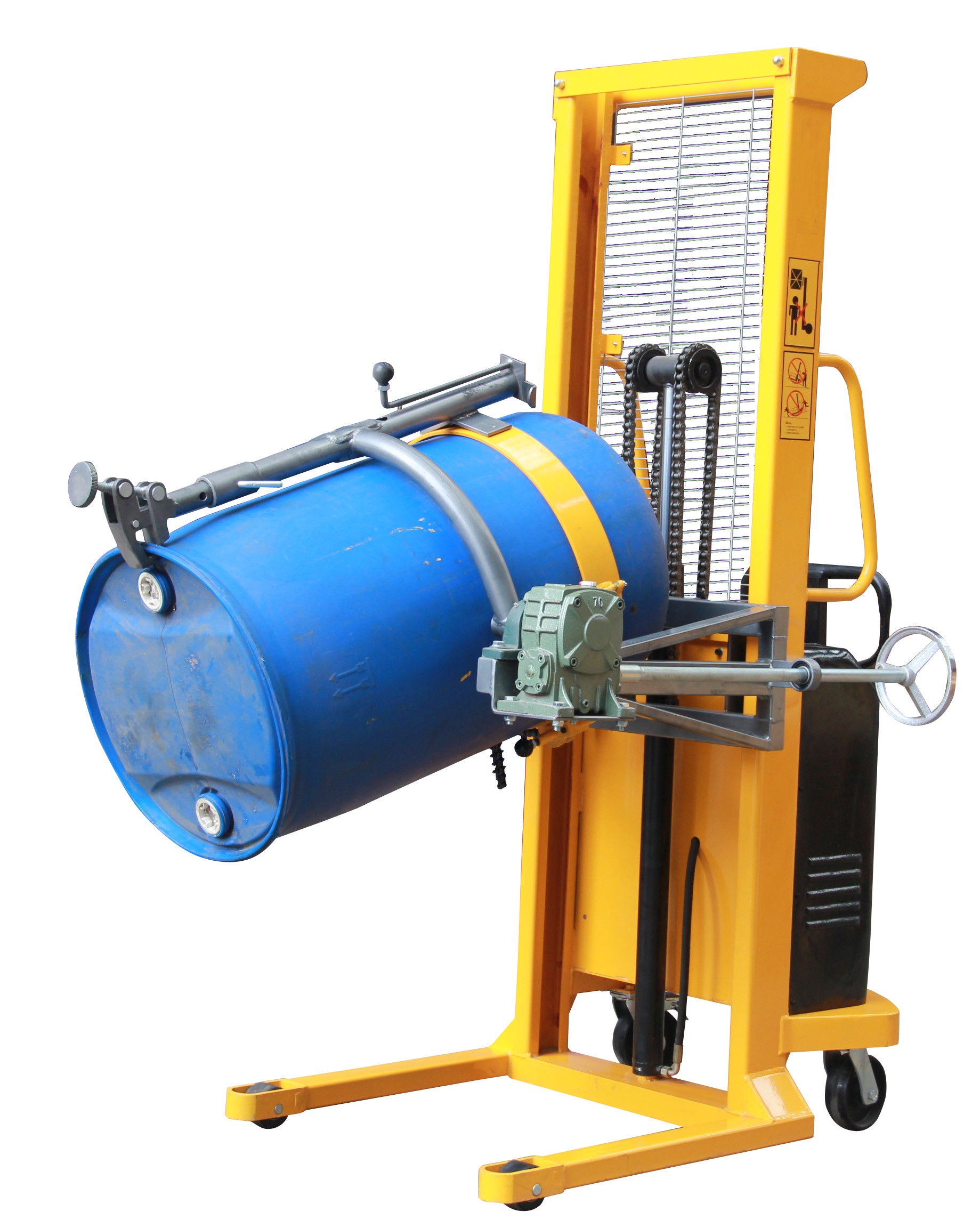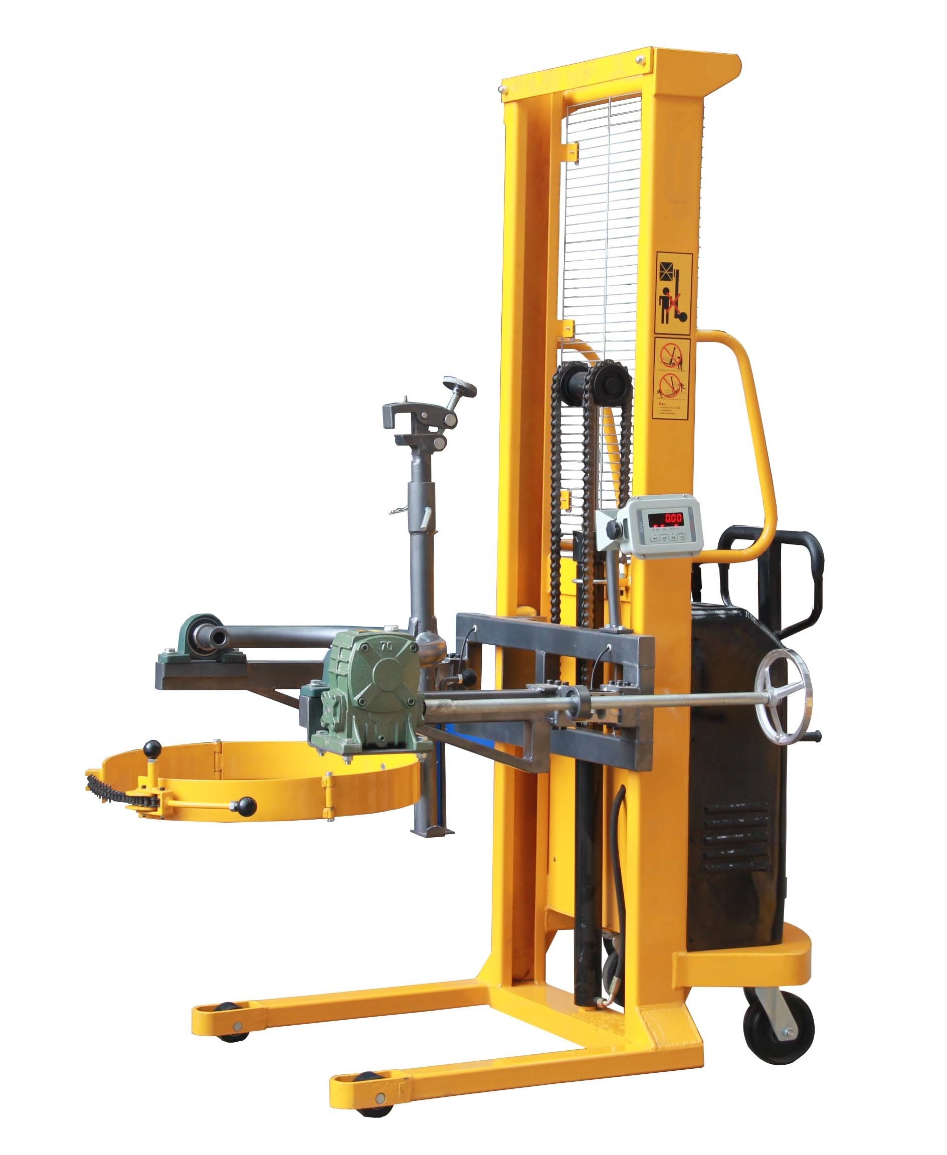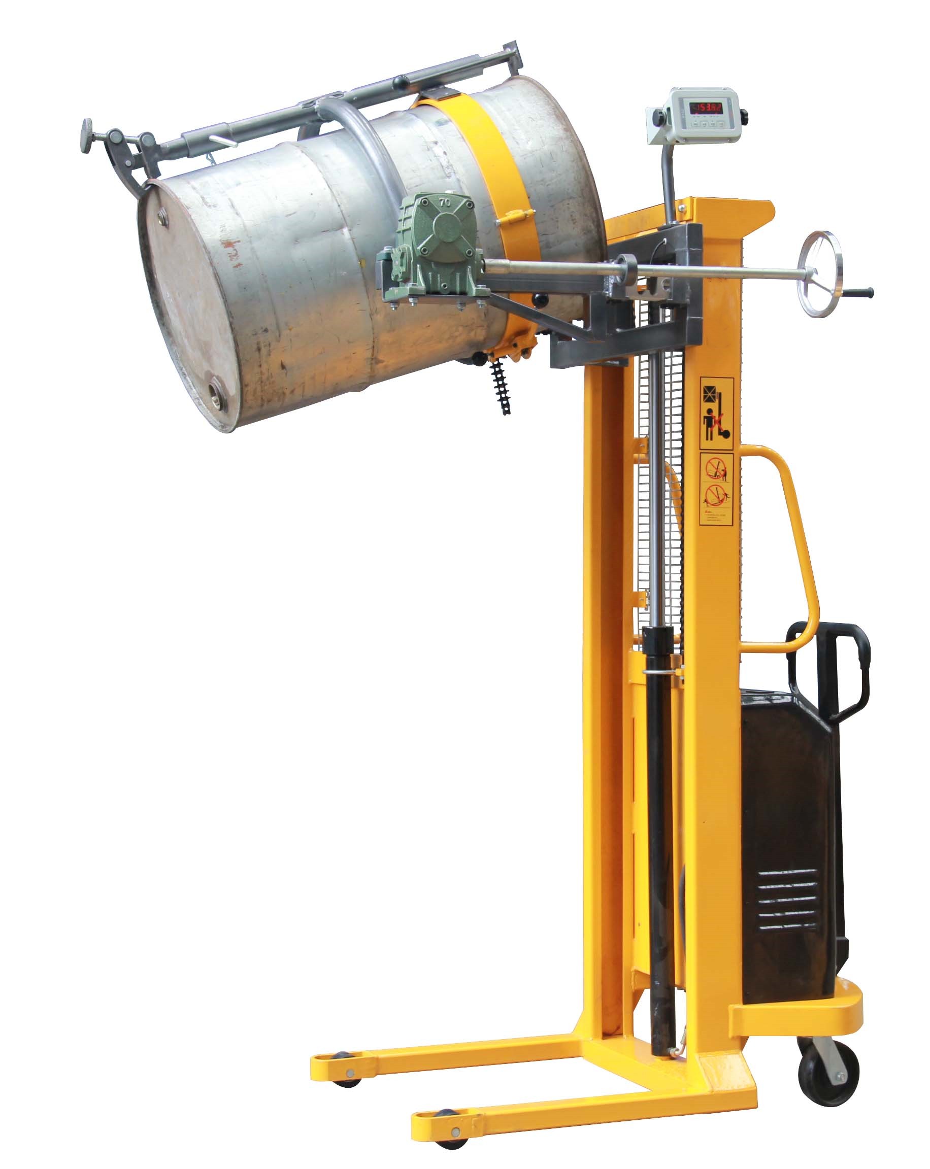 1、油桶翻转车设计结构简单轻巧,电动180度翻转,操作简便省力。