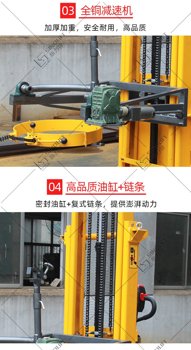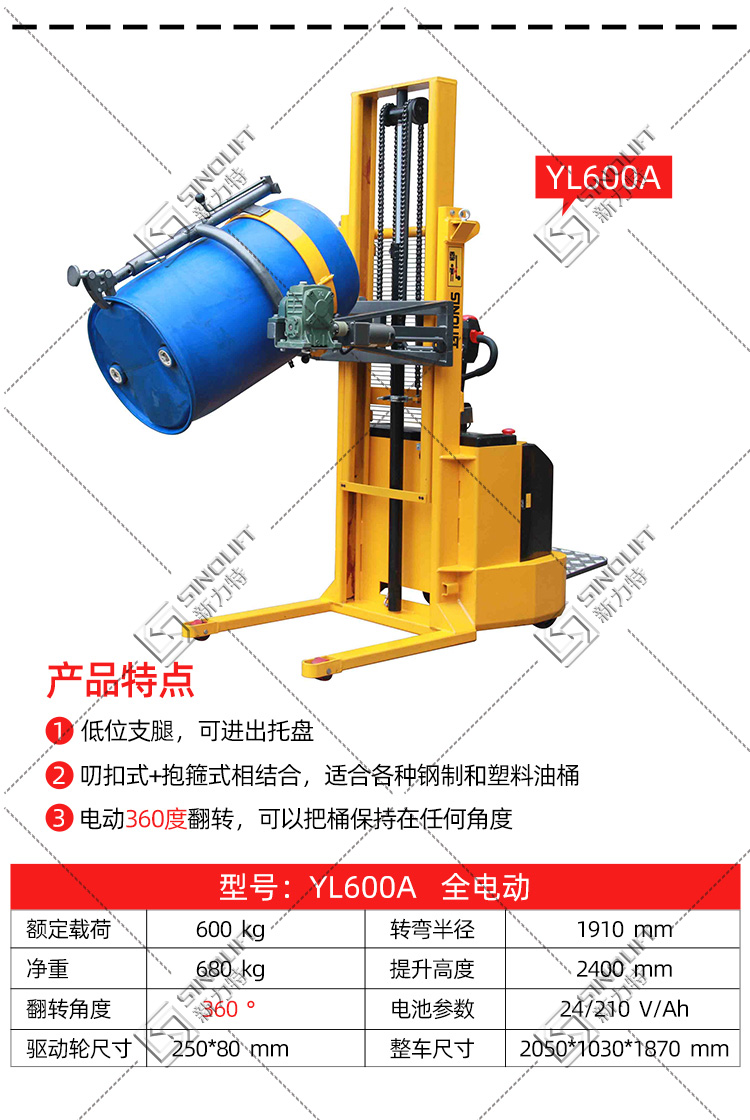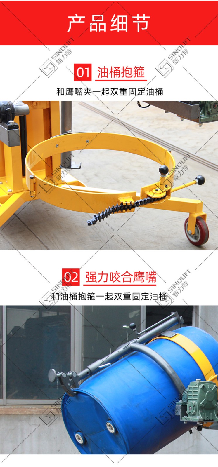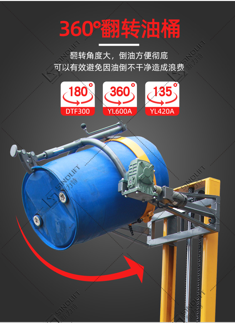 3.人机合一的多功能控制手柄,外观优美,操作简单,可对55加仑铁桶、等圆桶进行抱夹提升、翻转,能够实现145°倒油操作,完全可以将液体物料倾倒干净。