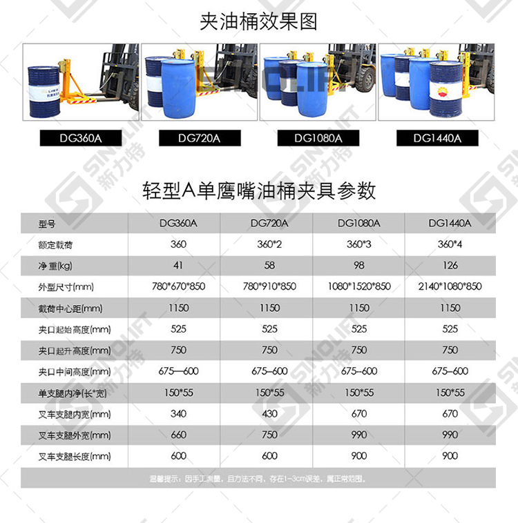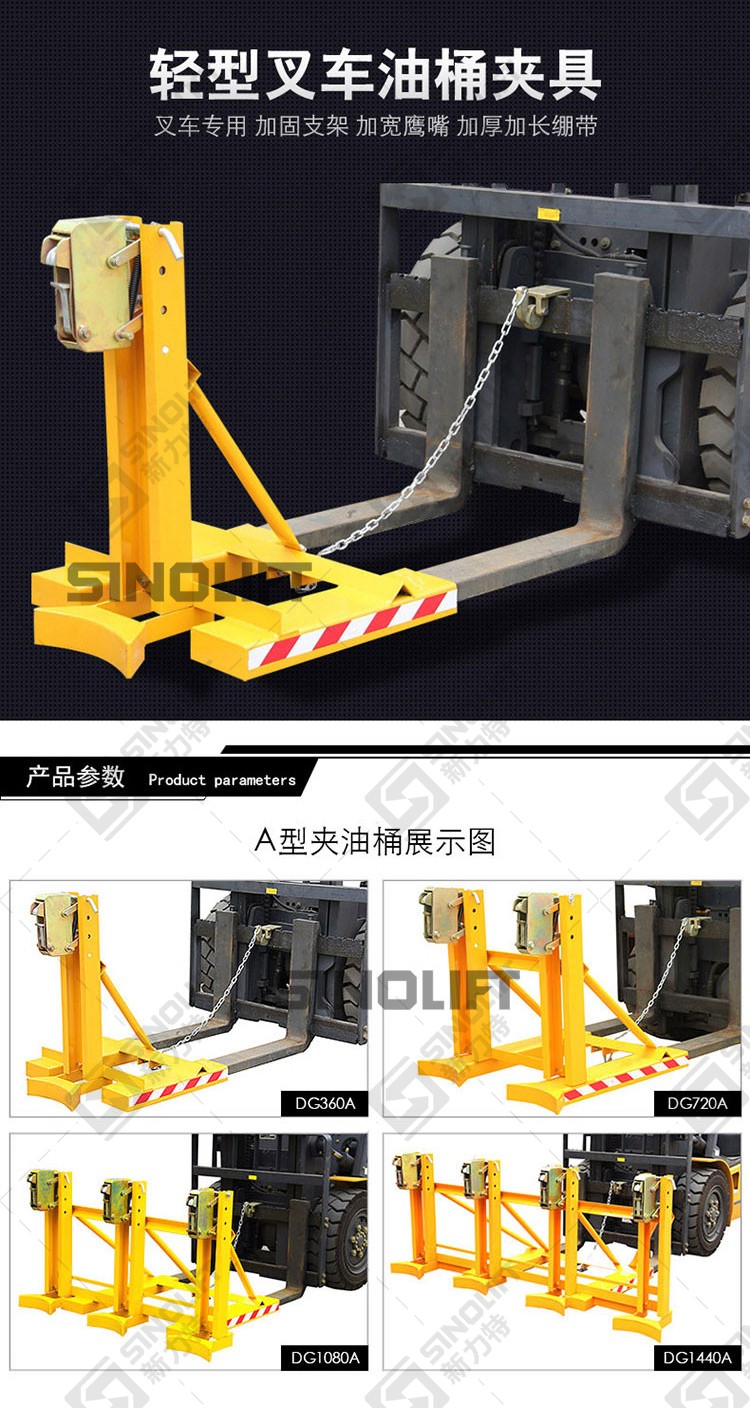 名称:DG360A DG720A DG1080A DG1440A轻型叉车用油桶夹