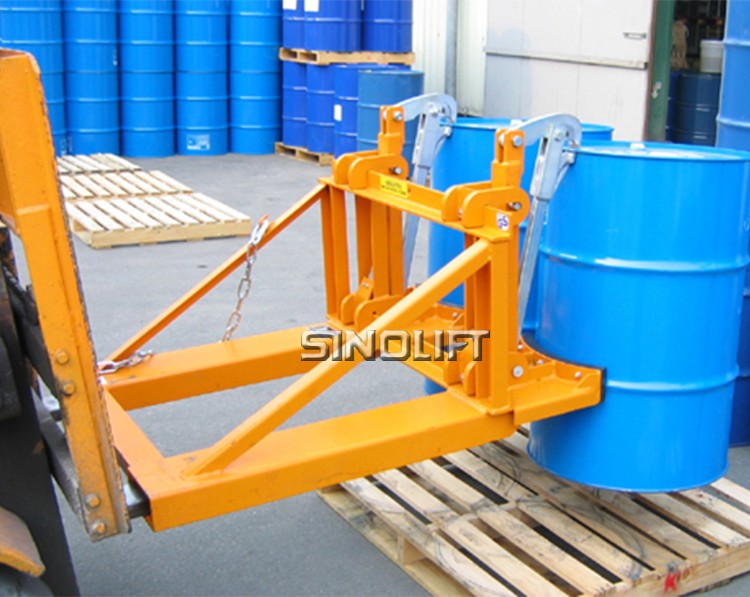 1. 纯机械结构设计的重型双桶夹具可与叉车方便地配合,仅依靠叉车的动作,不需要其它动力,可自动一次搬运2个桶。