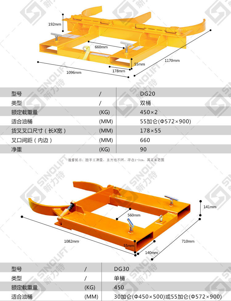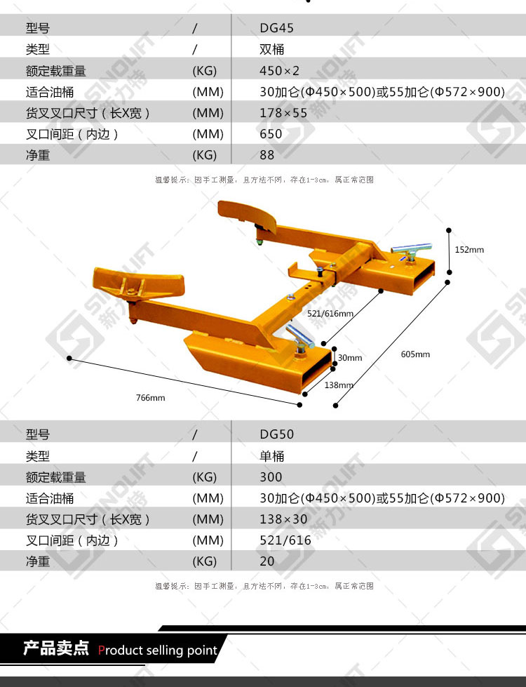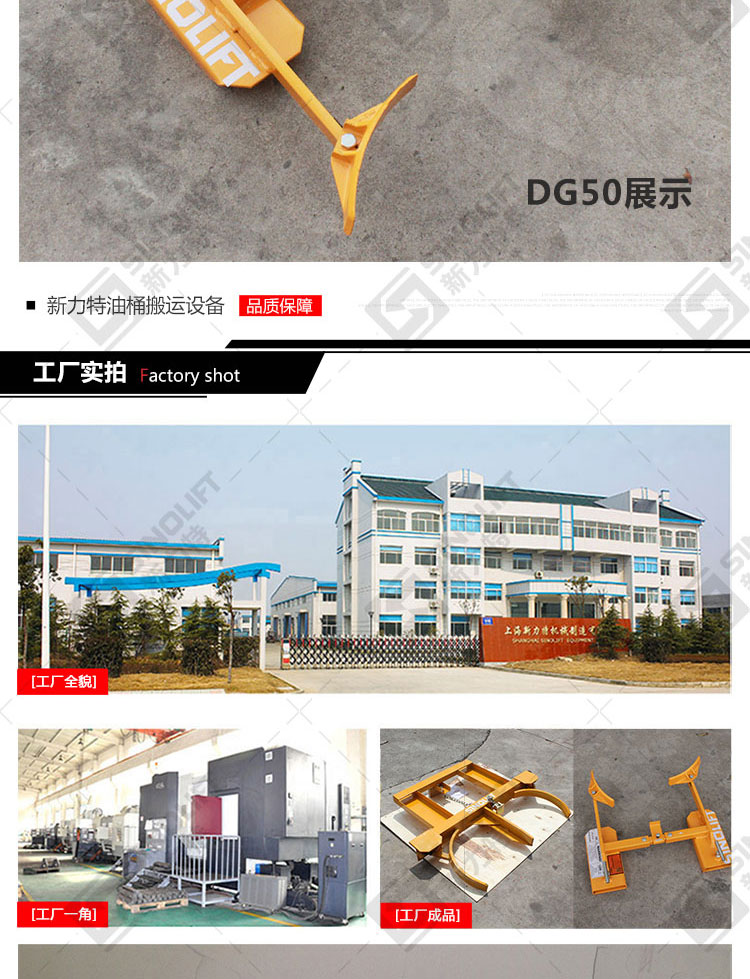 6.DG45,DG50适用于搬运30加仑(φ450*500)钢桶或50加仑(φ572*900)钢桶。