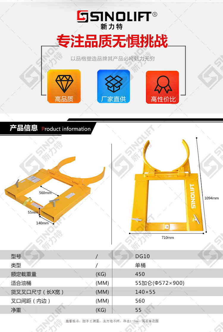 3.DG10适用于搬运55加仑钢桶。