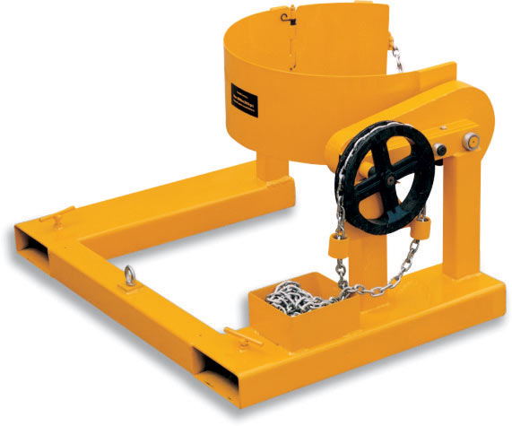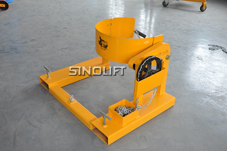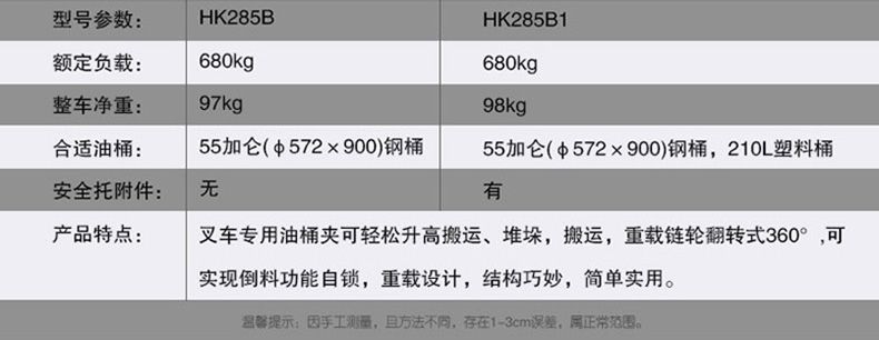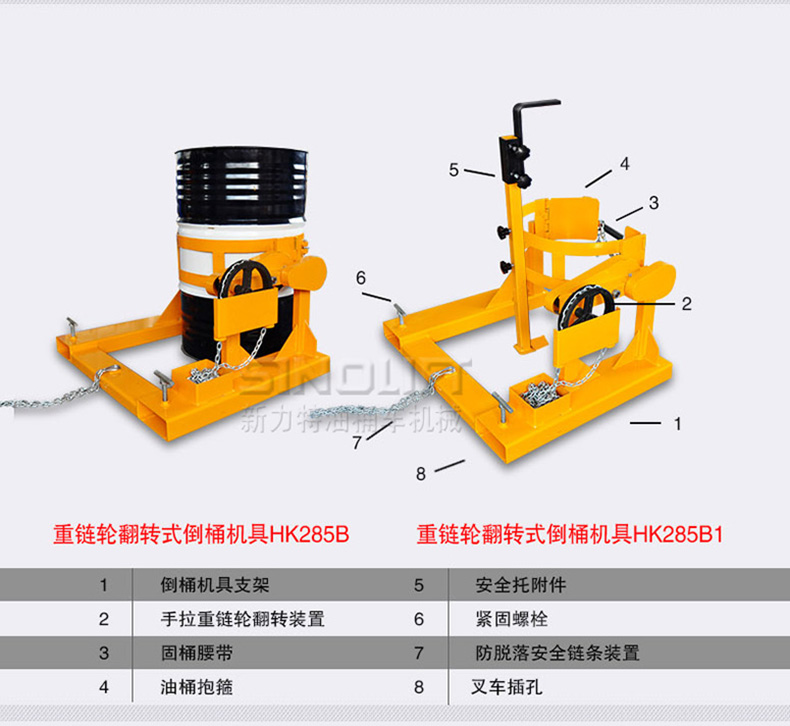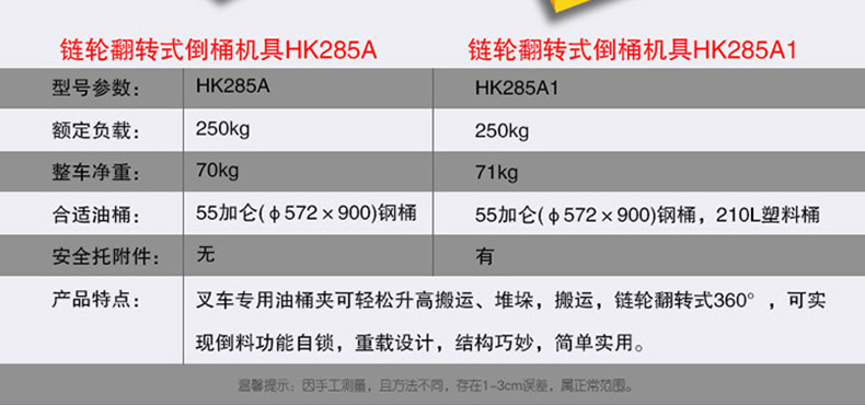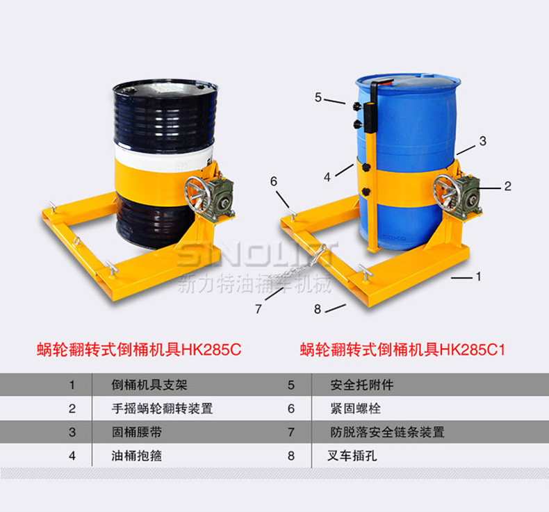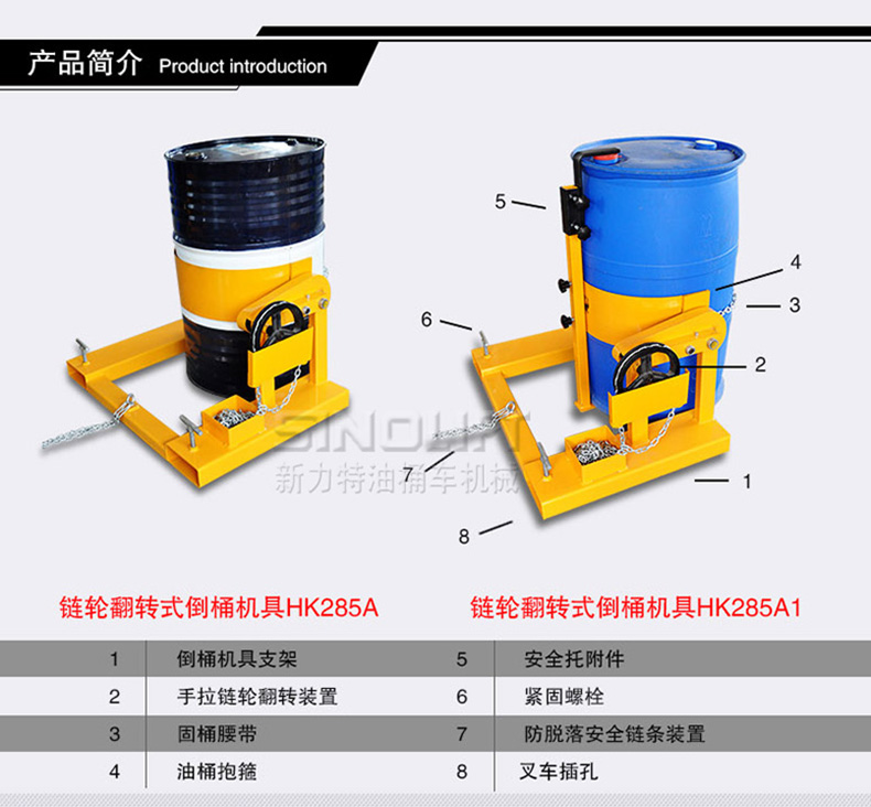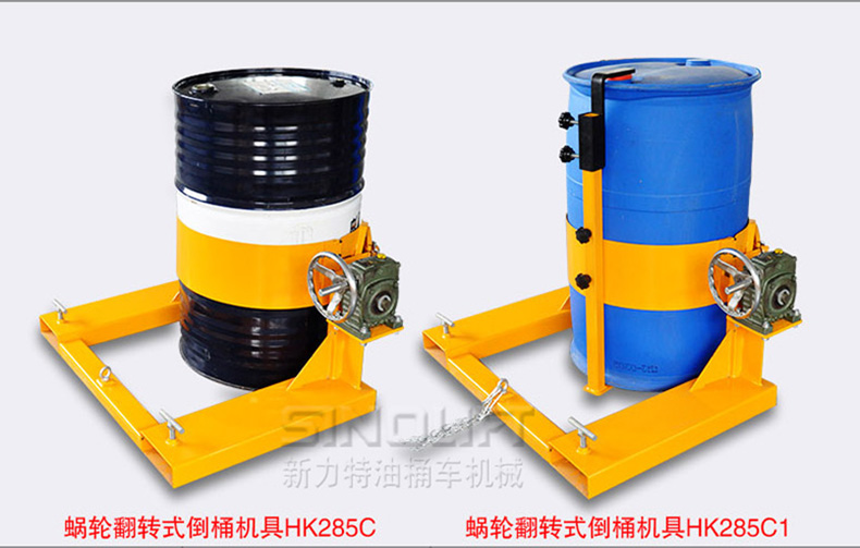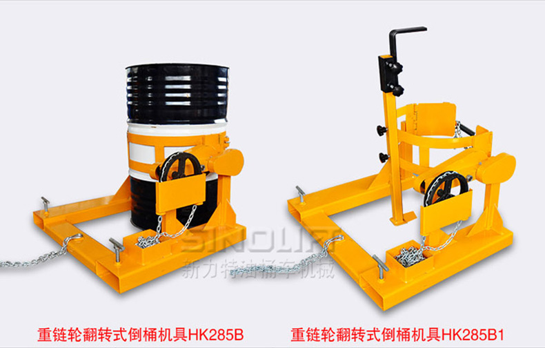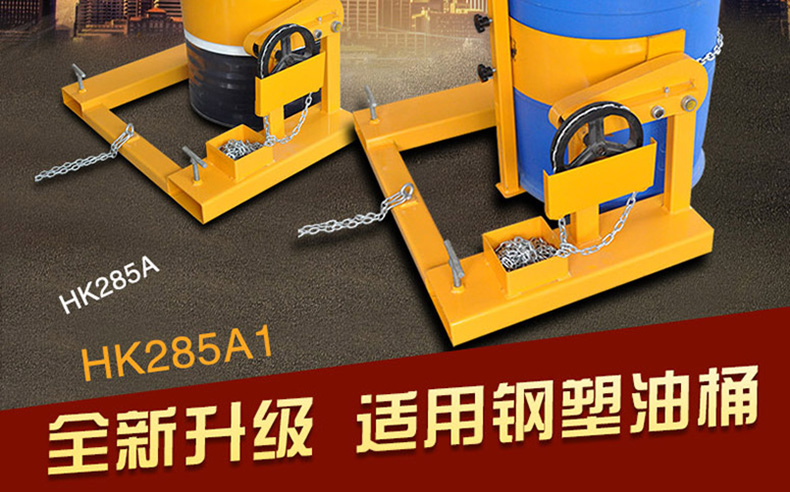 3、HK285A,HK285B驾驶员无需离开叉车,通过链条即可实现油桶的翻转,HK285C通过手摇实现油桶翻转。