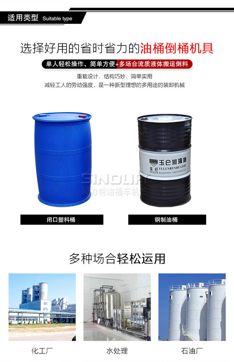 5. 适用于工厂,车间,仓库,油库的圆桶装卸,搬运,堆垛。