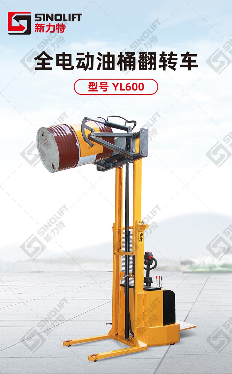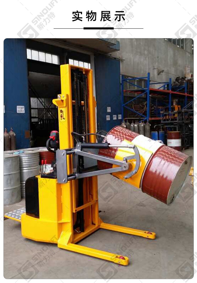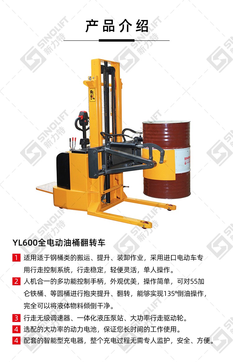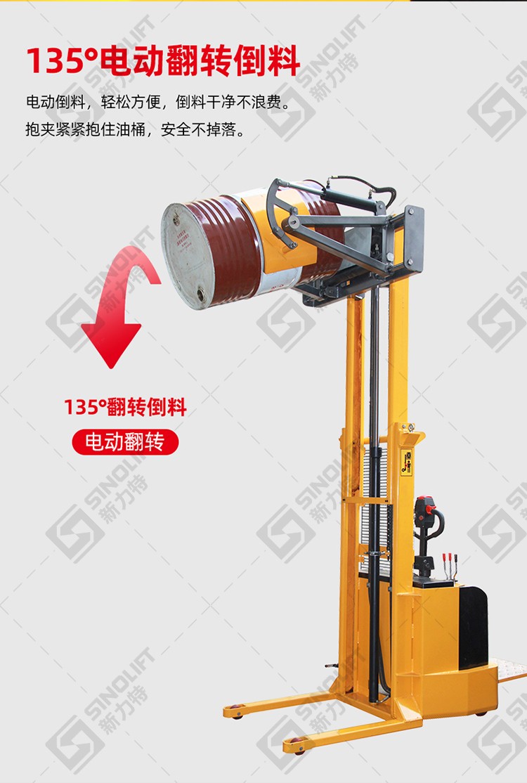 3人机合一的多功能控制手柄,外观优美,操作简单,可对55加仑铁桶、等圆桶进行抱夹提升、翻转,能够实现145°倒油操作,完全可以将液体物料倾倒干净;
