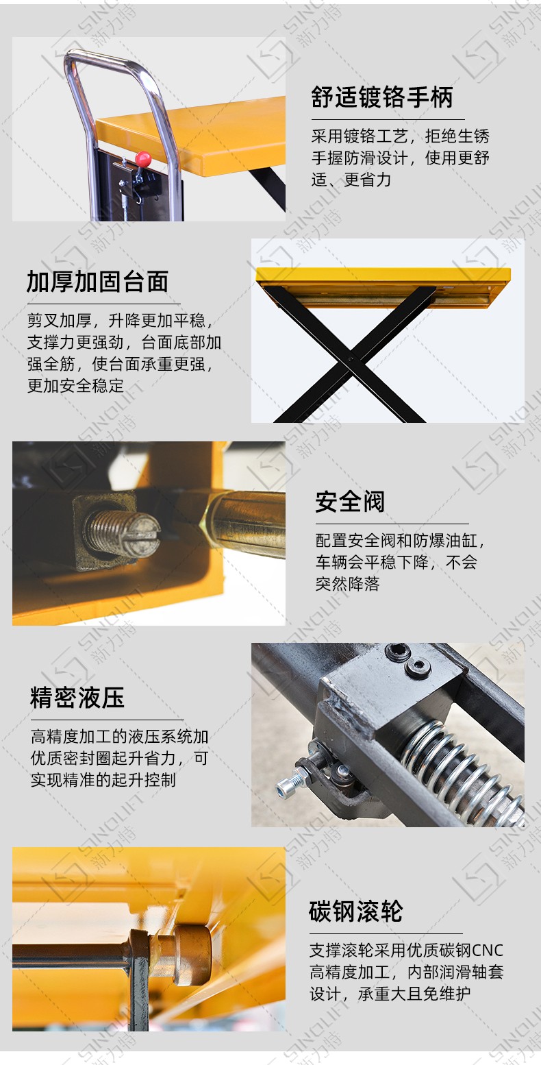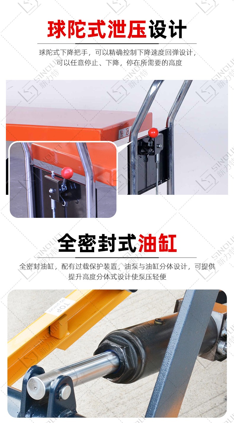 1.采用重型设计,承载能力强,高品质油缸,使货物起升平稳有力