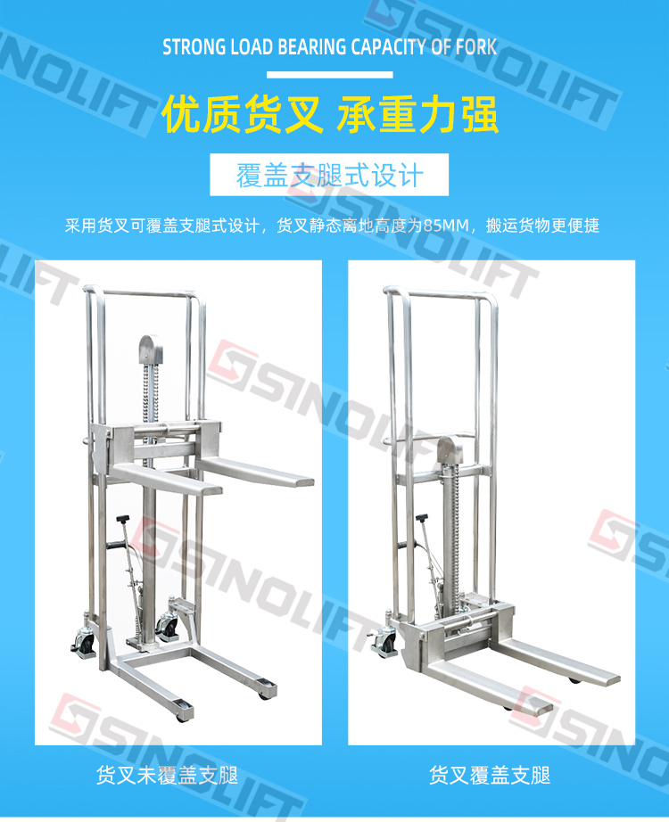 3.采用货叉可覆盖支腿式设计,货叉静态离地高度为85mm,搬运货物更便捷