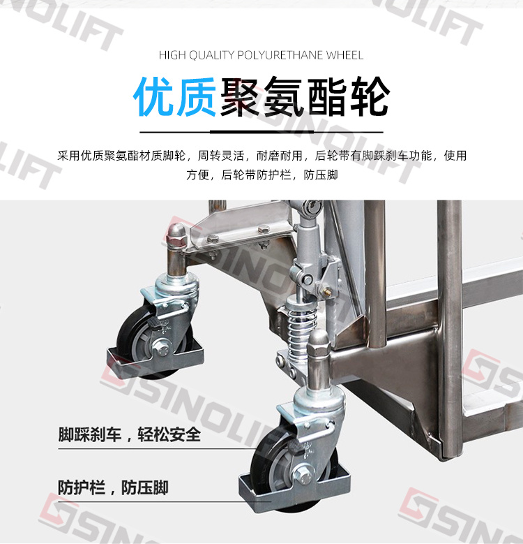 5.优质聚氨酯轮,周转灵活,后轮带有脚踩刹车功能,使用方便,后轮带防护栏,防压脚