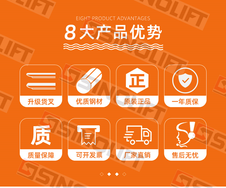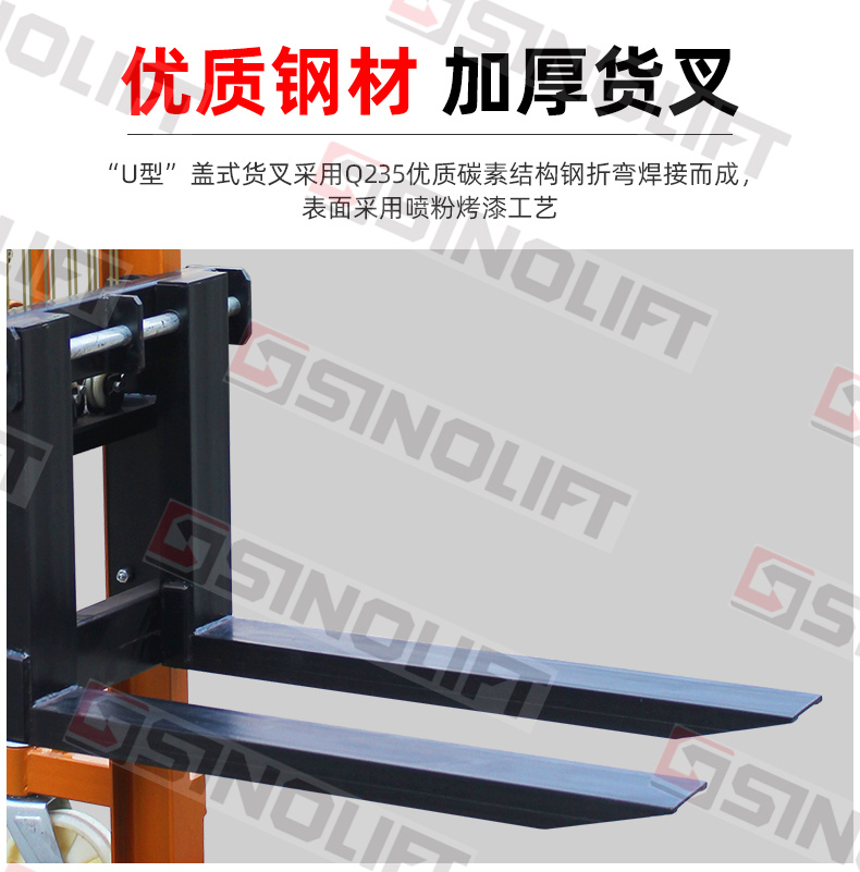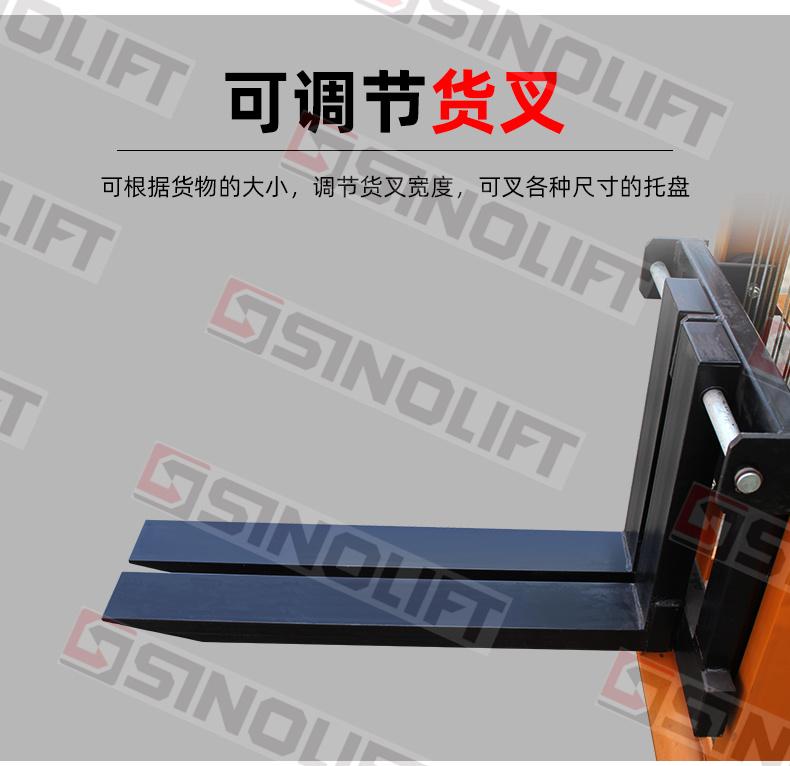 2、可根据货物的大小,调节货叉宽度,可叉各种尺寸的托盘。