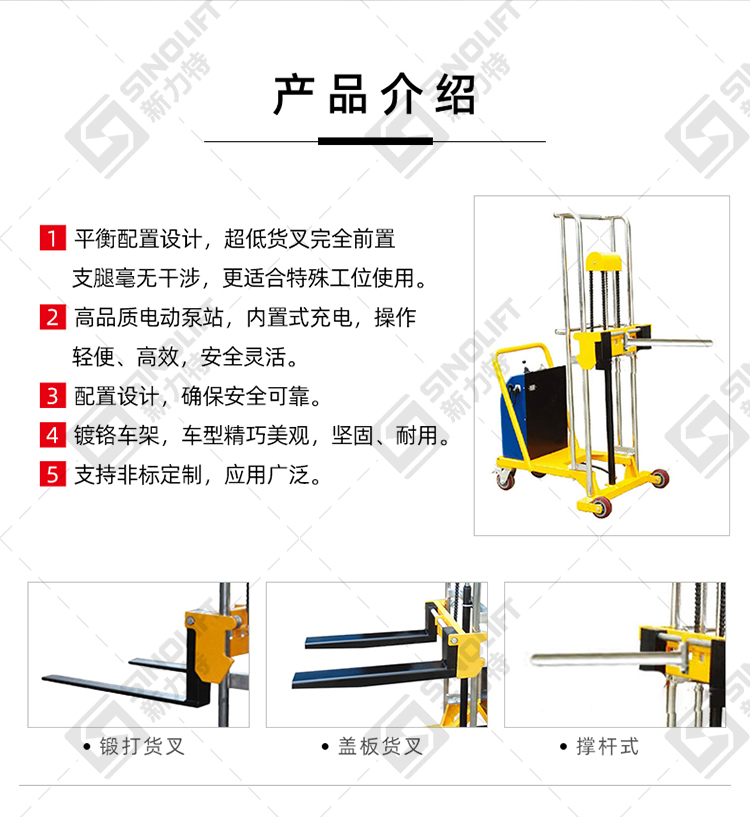 1.平衡配置设计,超低货叉完全前置,支腿毫无干涉,更适合特殊工位使用。
