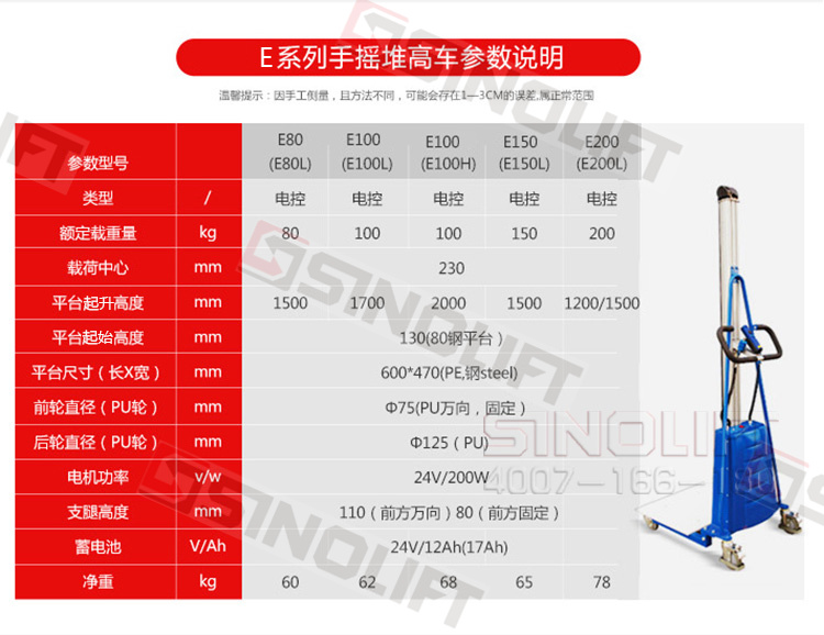 | 最大载重 | (kg) | 80 | 100 | 100 | 150 | 200 |