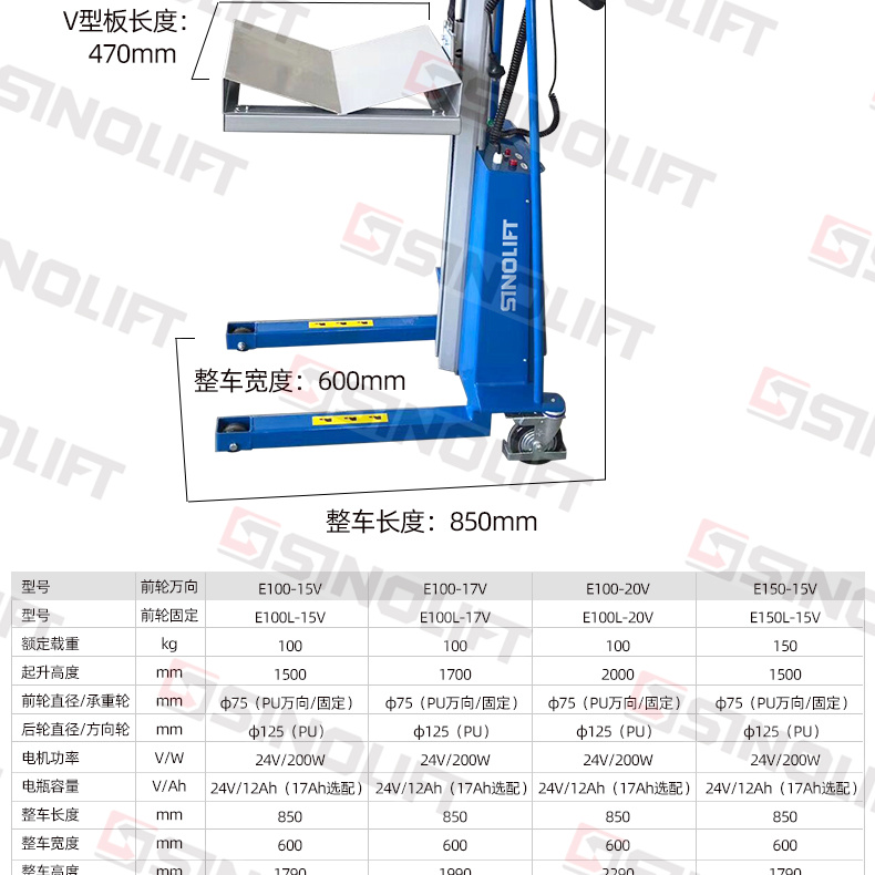 | 型号 | 前轮万向 | E100-15V | E100-17V | E100-20V | E150-15V |