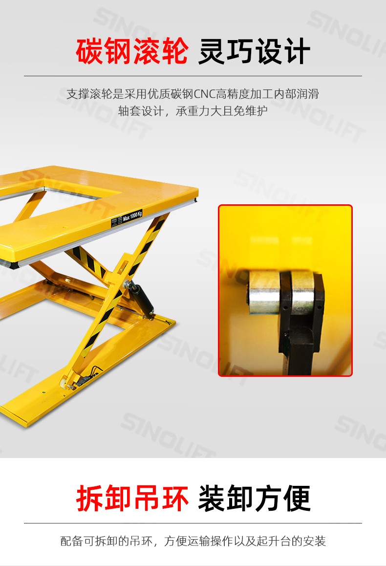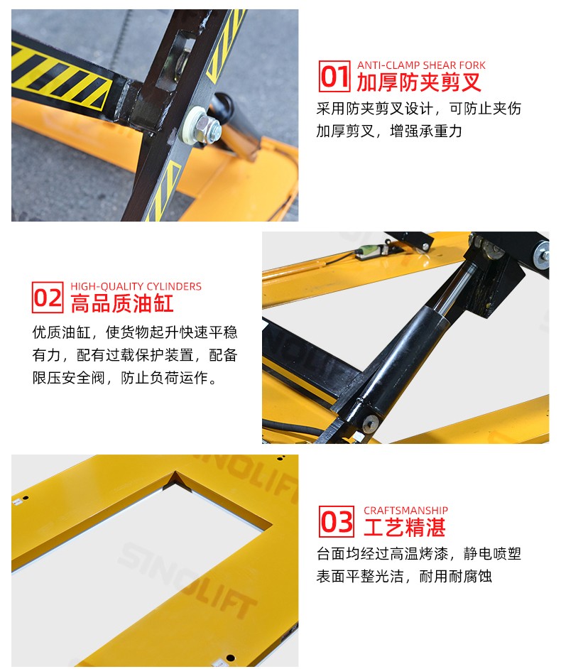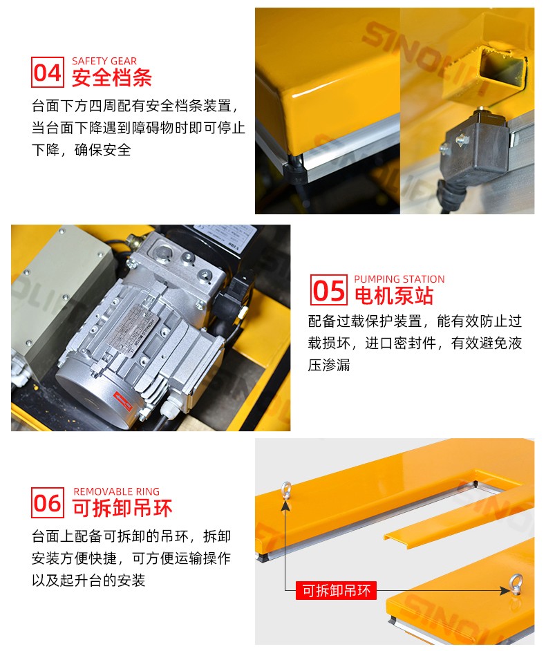 台面配有国内独创的安全装置,确保台面下降时遇到障碍物停止下降;