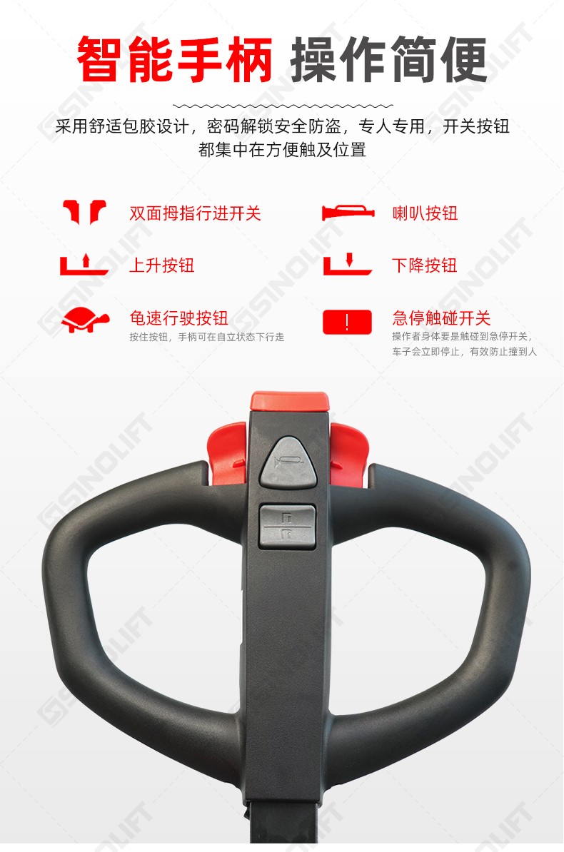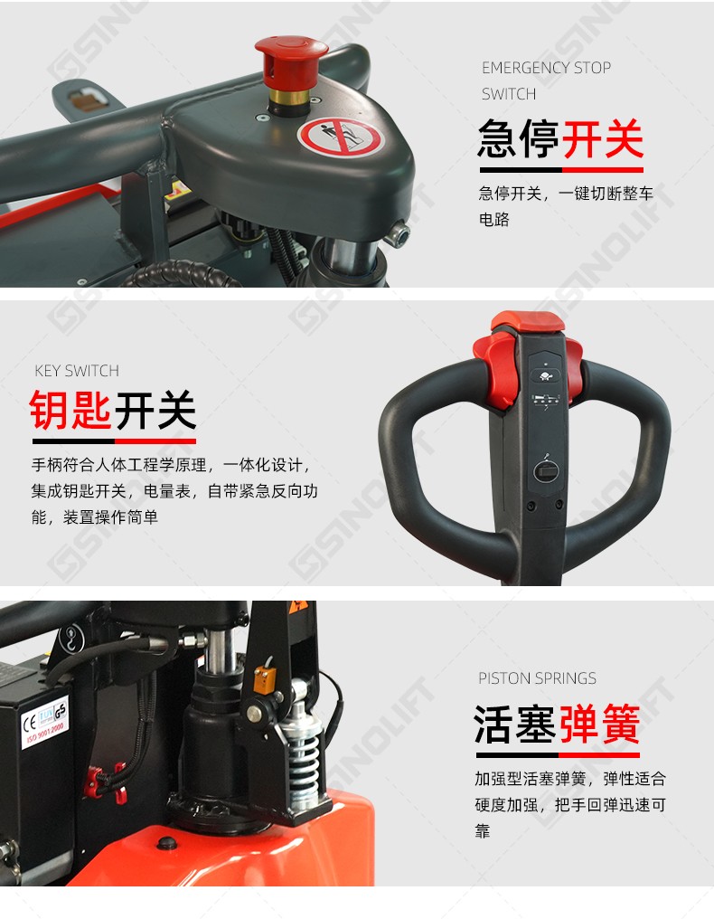 2.标配急停开关,紧急反向装置,外置充电器;