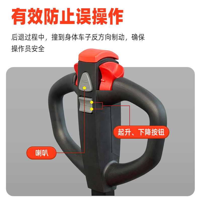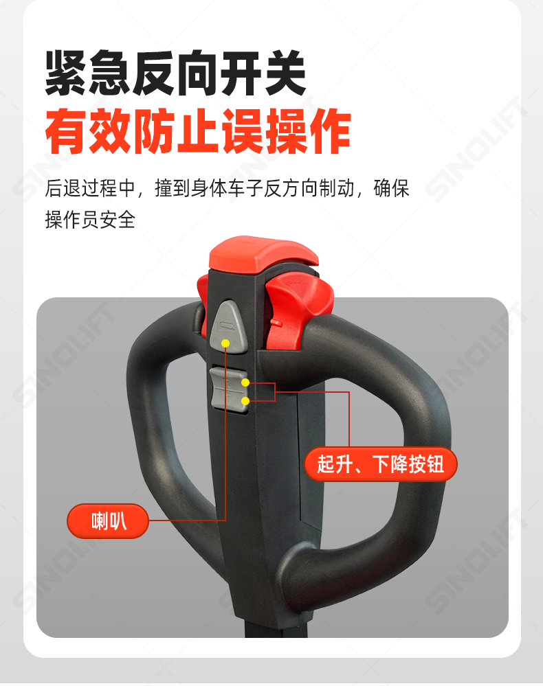 紧急反向开关,有效防止误操作,后退过程中,撞到身体车子反方向制动,确保操作员安全