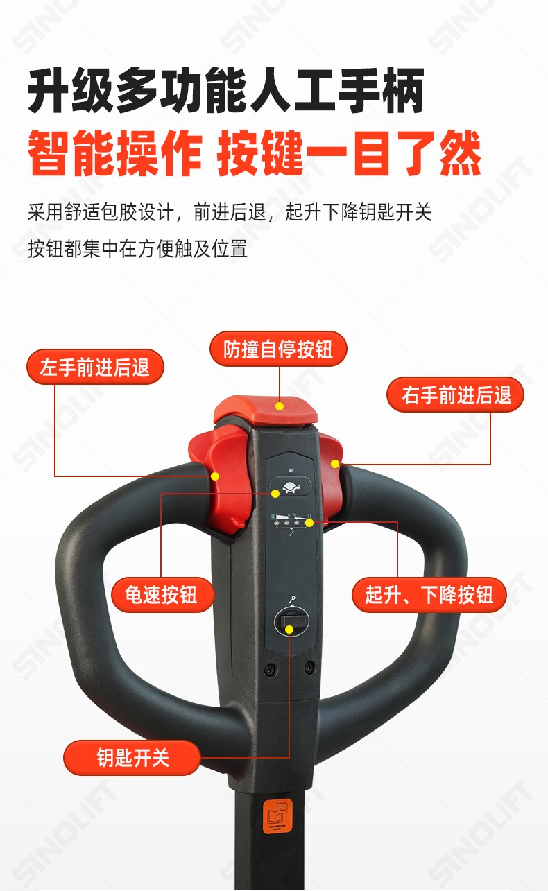 升级多功能人工手柄,采用舒适包胶设计,前进后退,起升下降钥匙开关
