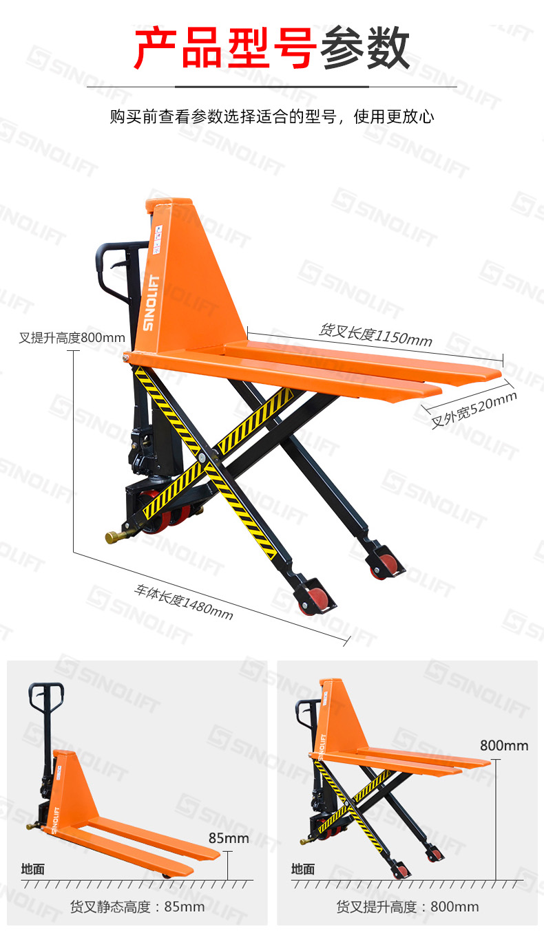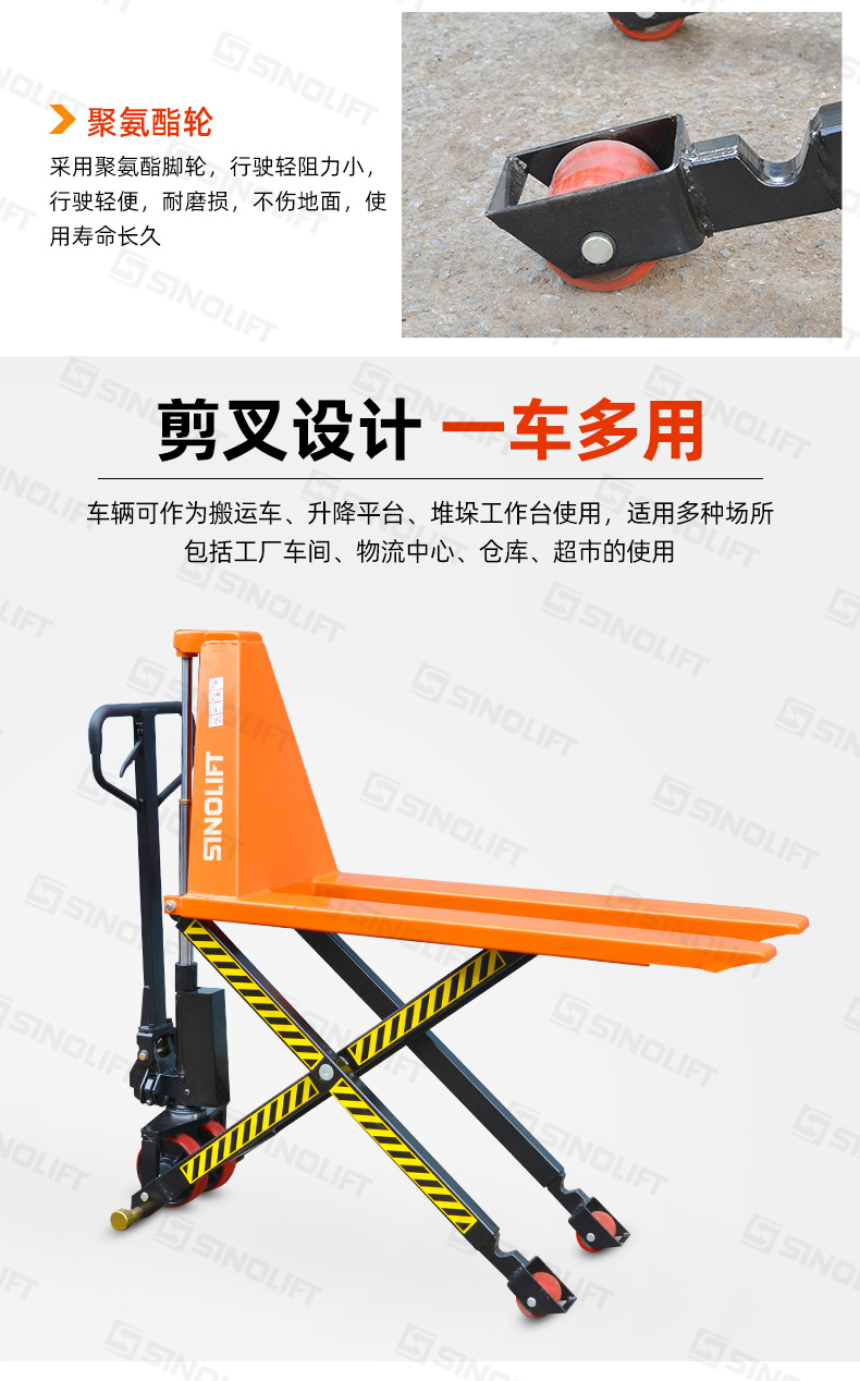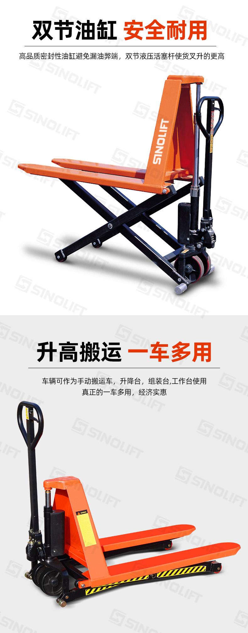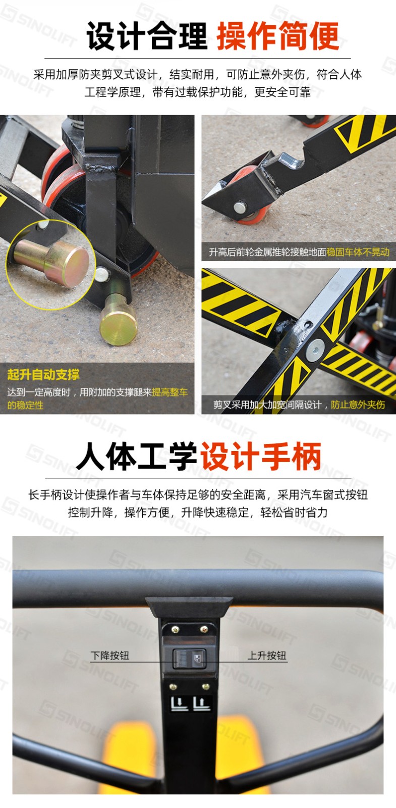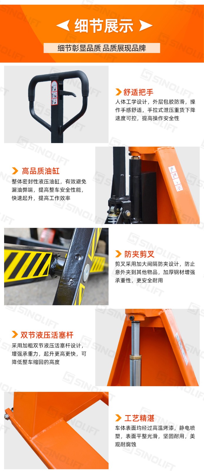 起升范围可适应不同的搬运高度,减少了弯腰搬运货物的烦恼。