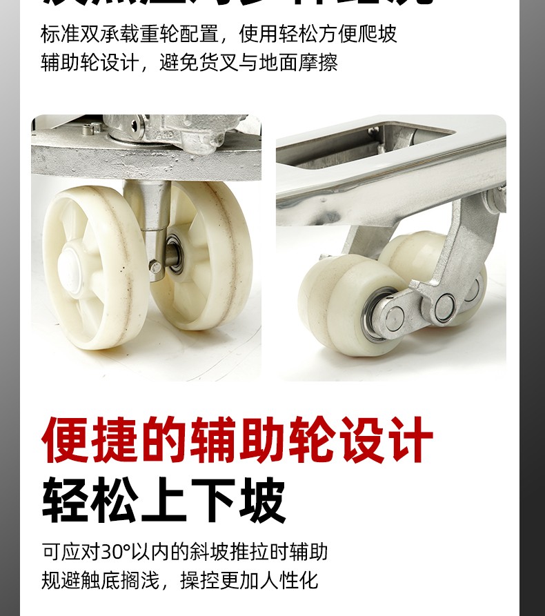 便捷的辅助轮设计轻松上下坡;可应对30°以内的斜坡推拉时辅助规避触底搁浅,操控更加人性化。