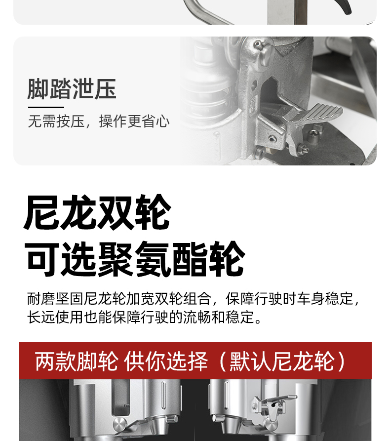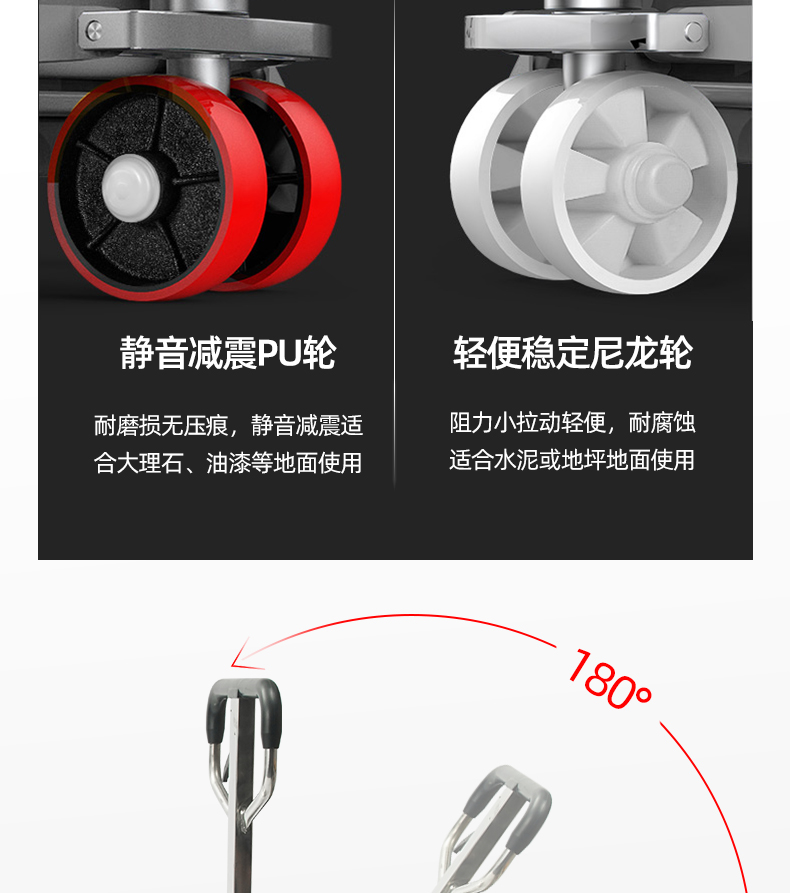 轻便稳定尼龙轮;阻力小拉动轻便,耐腐蚀适合水泥或地坪地面使用;