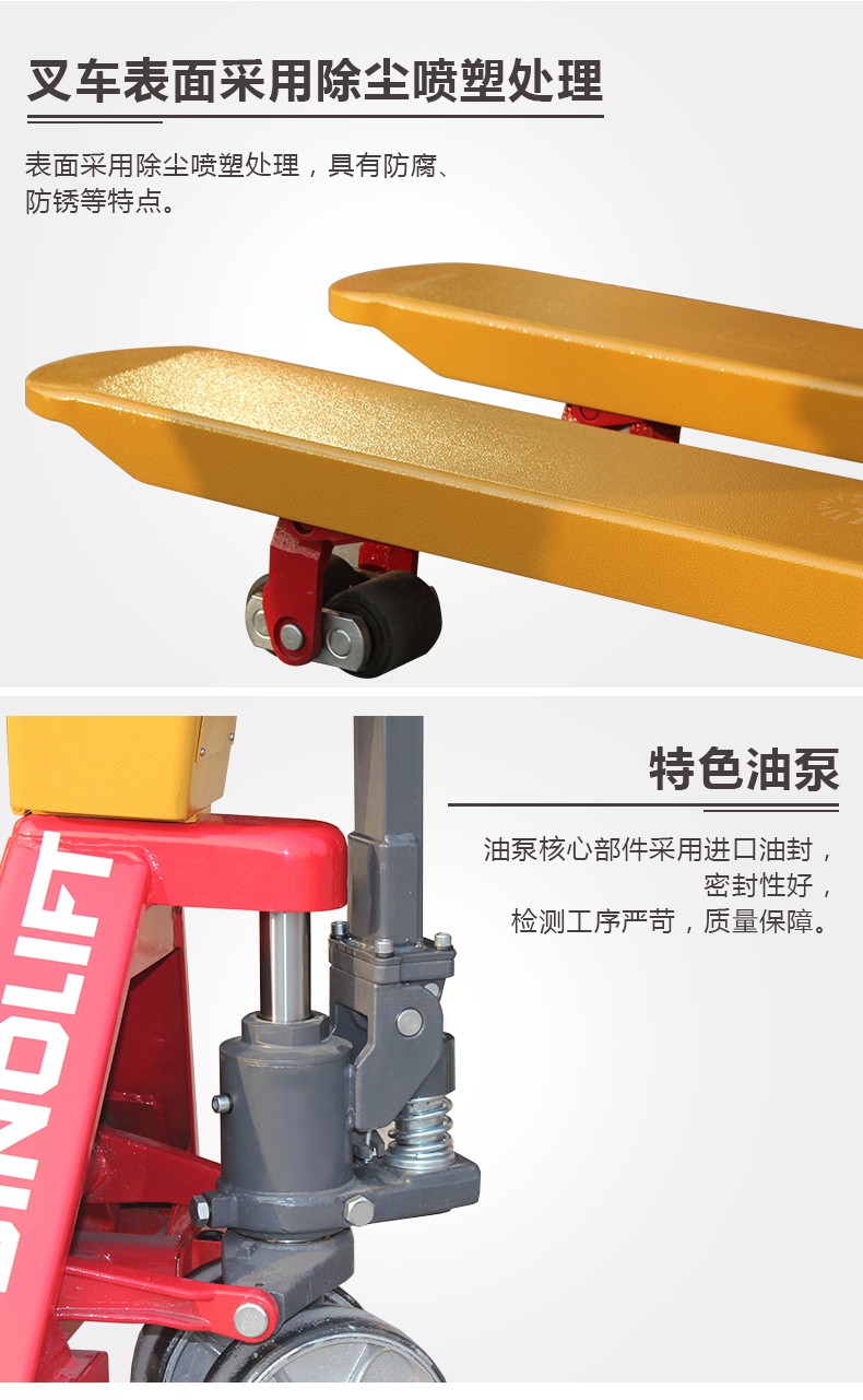 叉车表面采用除尘喷塑处理,具有防腐,防锈等特点。油泵核心部件采用进口油封密
