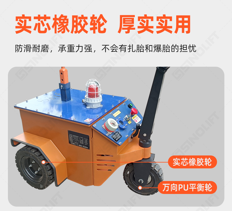 防滑耐磨,承重力强,不会有扎胎和爆胎的担忧,搭配实芯橡胶轮胎,轻松应对各种地面,轻松应对各种不同路面,让您畅行无忧;牵引更方便。